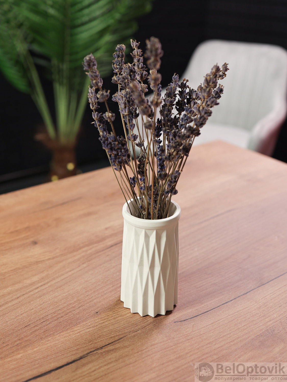 - Универсальность и стиль. Лаконичный геометрический дизайн и нейтральный цвет делают вазу идеальным элементом декора для любого интерьера — от скандинавского минимализма до уютного лофта. Она самодостаточно выглядит как в композиции с сухоцветами, так и сама по себе.