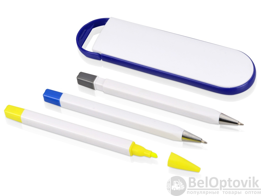 - Комплектность: ручка шариковая, карандаш и маркер, футляр