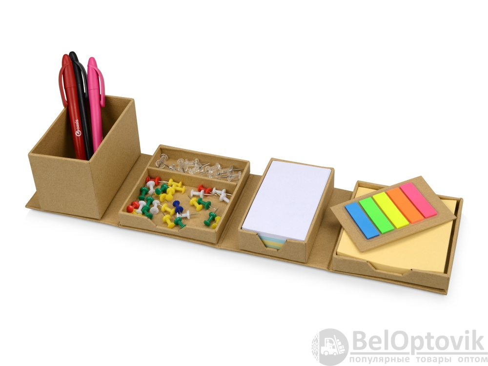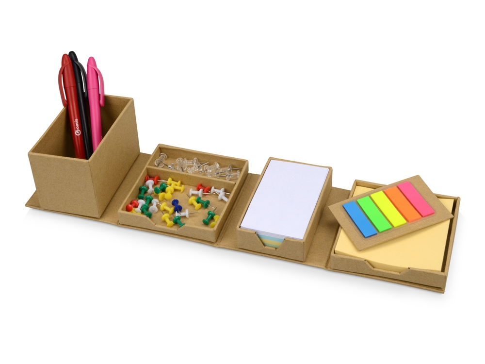 Оригинальная подставка для канцелярии «Брик» в сложенном виде представляет собой куб. А в разложенном – она превращается в удобный настольный прибор с отделениями для стикеров, бумаги для записей, скрепок и ручек. Настольный куб «Брик» сделан из бумаги и картона, и является отличным экосувениром.
