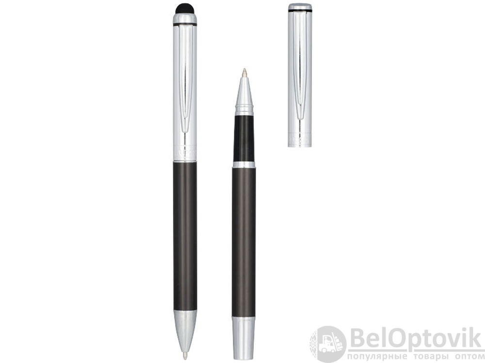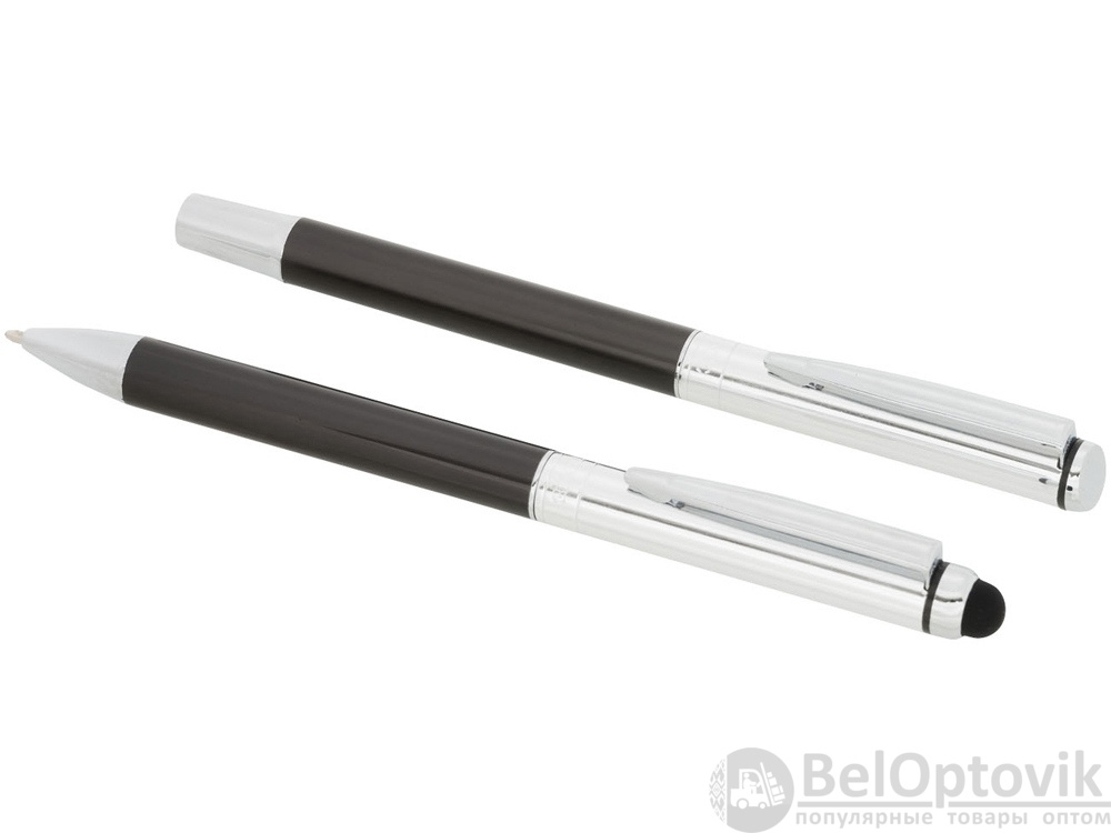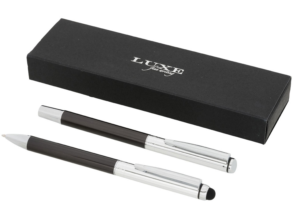 Набор с шариковой ручкой и ручкой-стилусом. Эксклюзивный набор ручек, включающий шариковую ручку-стилус и ручку-роллер. Обе ручки предлагаются с графитовой нижней частью корпуса и полированной хромированной верхней частью. В набор входят запасные чернила и стилус с прорезиненным наконечником для работы с планшетами и смартфонами. Предлагается в подарочной коробке LUXE (17 x 5,5 x 3 см). Металл.