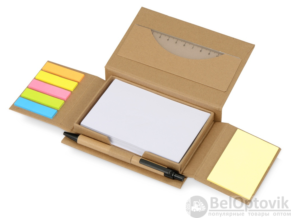 Многофункциональный набор для записей и заметок. Все что необходимо на рабочем столе в компактном футляре из переработанного картона: стикеры, бумага для записей, линейка, ручка.