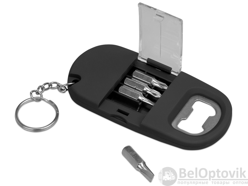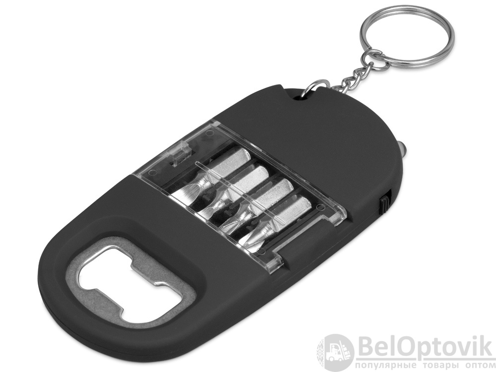 Брелок включает в себя 2 плоские и 2 крестообразные насадки, прочную металлическую открывалку и небольшой фонарик. Корпус сделан из плотного пластика с мягким покрытием soft-touch. Встроенный фонарик позволяет подсвечивать рабочую зону.