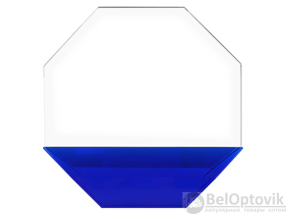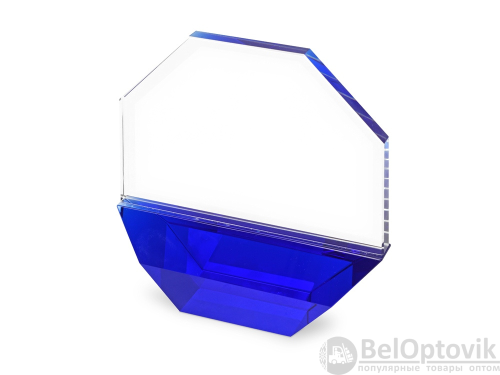 Награда в форме восьмигранника, который является древним символом наивысших достижений человека и духовного подъема, прекрасно выразит признательность и уважение, заложенное в такой бизнес-подарок. Нанесение доступно по всей площади награды, благодаря сочетанию прозрачного и синего стекла можно зонировать нанесение и экспериментировать с типами начертаний.