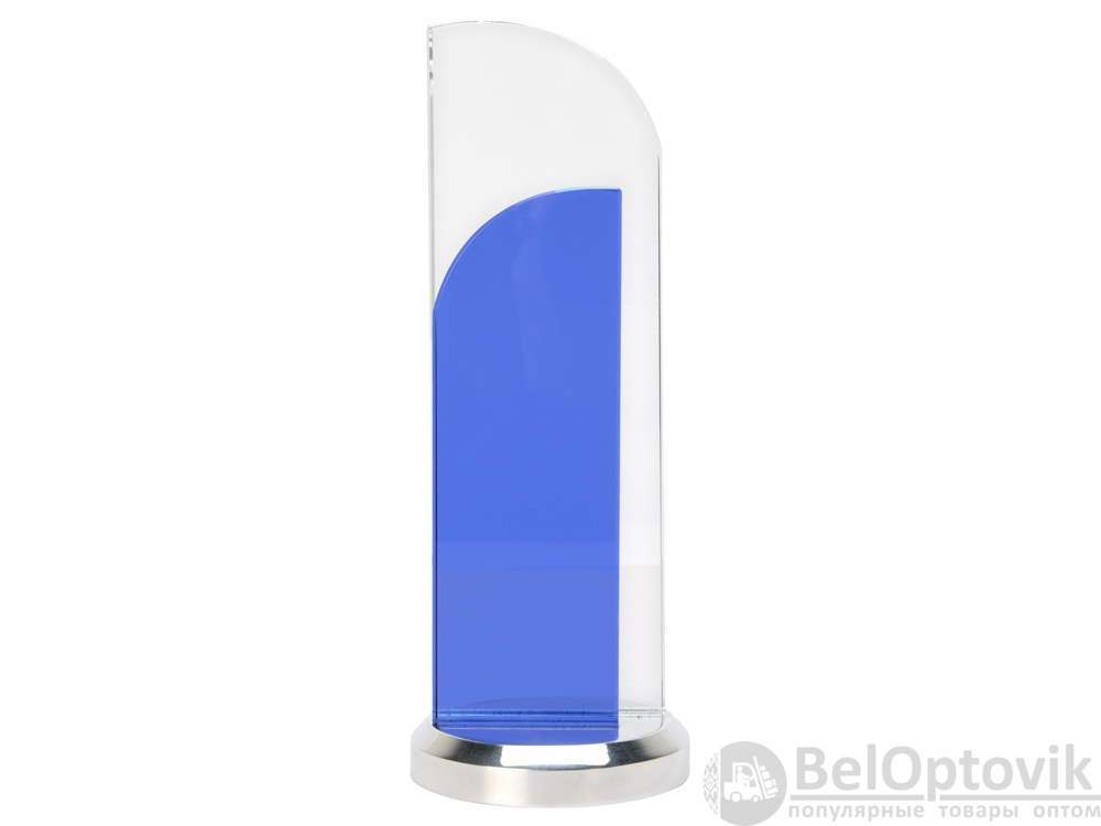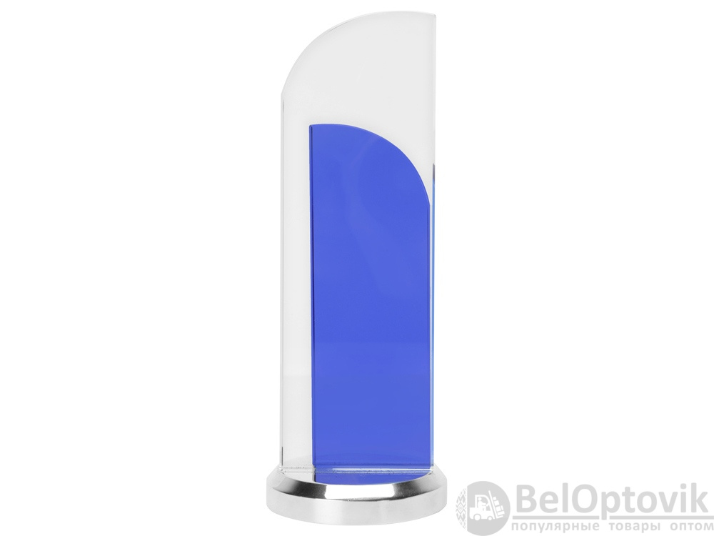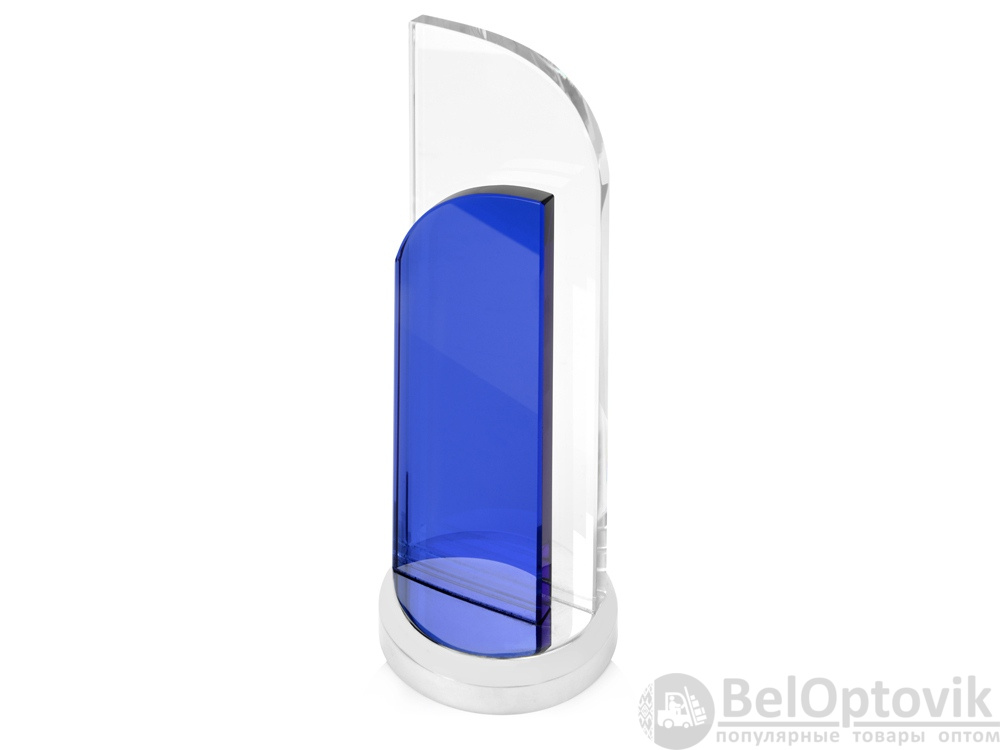 Утонченный вариант награды из стекла двух цветов. Конструкция воссоздает образ поднятого паруса. Нанесение можно сделать на любом из стеклянных элементов.