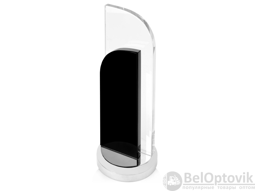 Утонченный вариант награды из стекла двух цветов. Конструкция воссоздает образ поднятого паруса. Нанесение можно сделать на любом из стеклянных элементов.