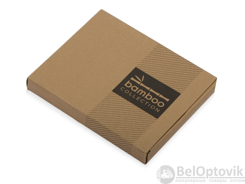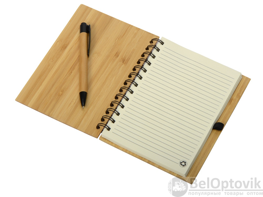 Набор с блокнотом и ручкой изготовлен из экологически чистых натуральных материалов. Обложка блокнота и корпус ручки из натурального бамбука, листы из переработанной бумаги.