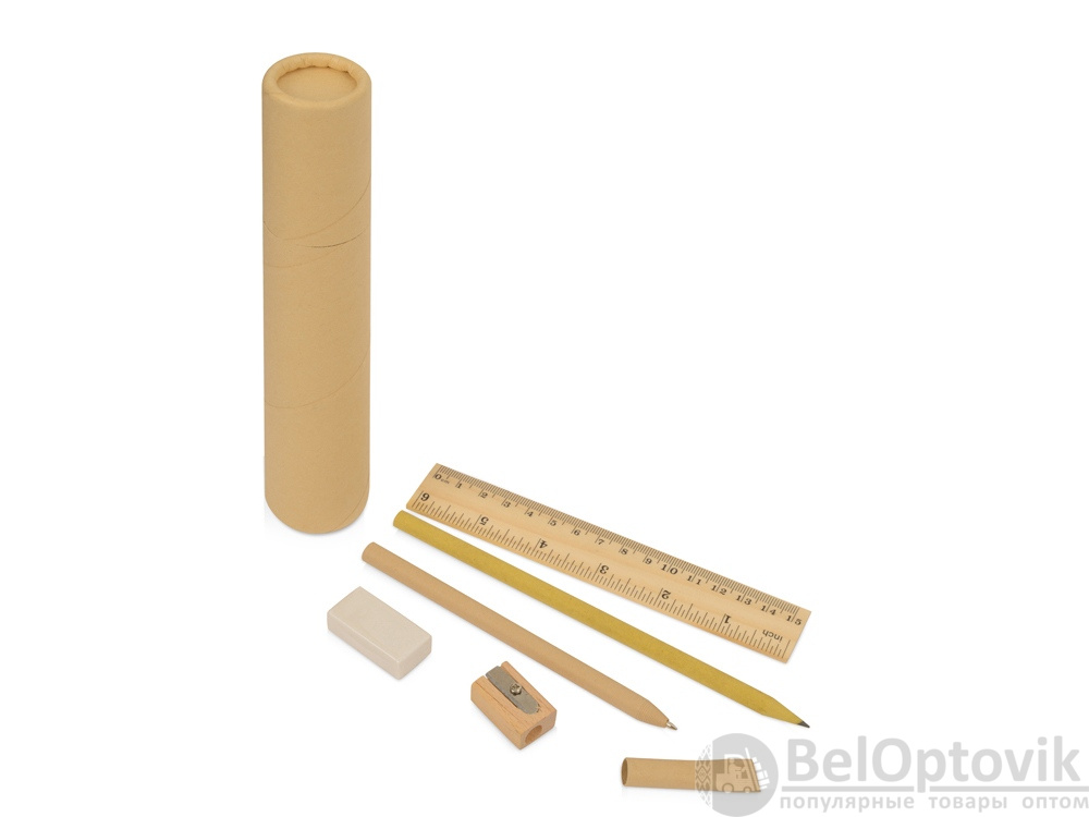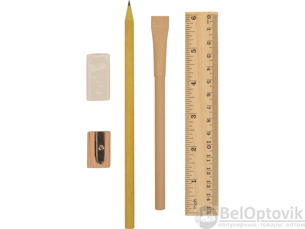 - Комплектность: линейка 15 см, точилка, карандаш, ручка шариковая, ластик