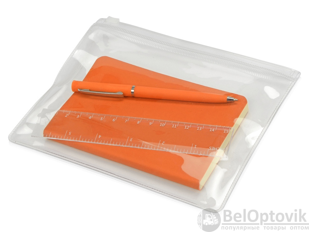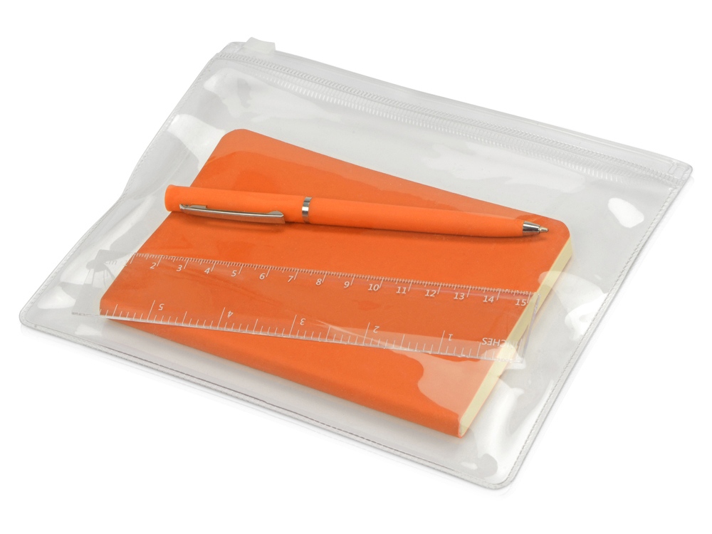В канцелярский набор входит прозрачный пенал из ПВХ с zip-замком и линейка, блокнот формата А6 в мягкой обложке с закругленными углами, элегантная пластиковая ручка с хромированными деталями. Корпус ручки с приятным тактильным soft-touch покрытием.