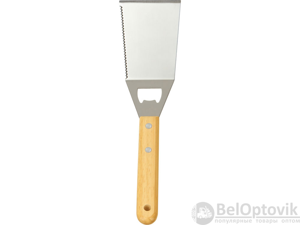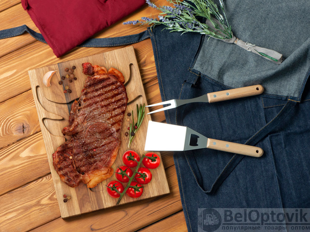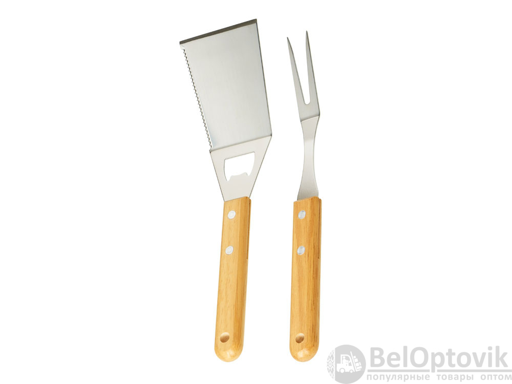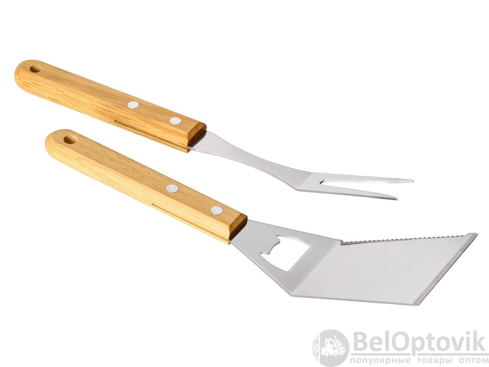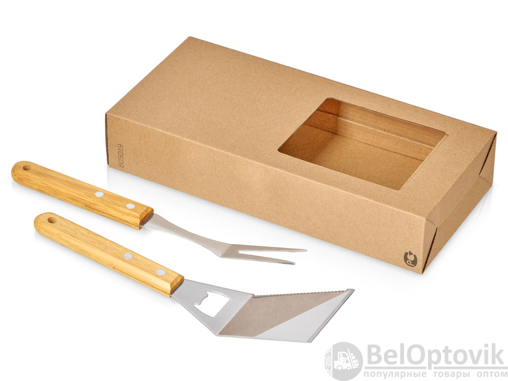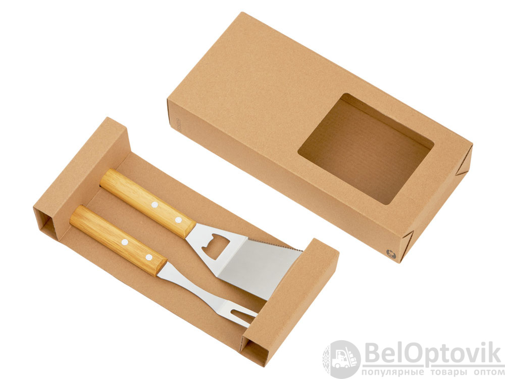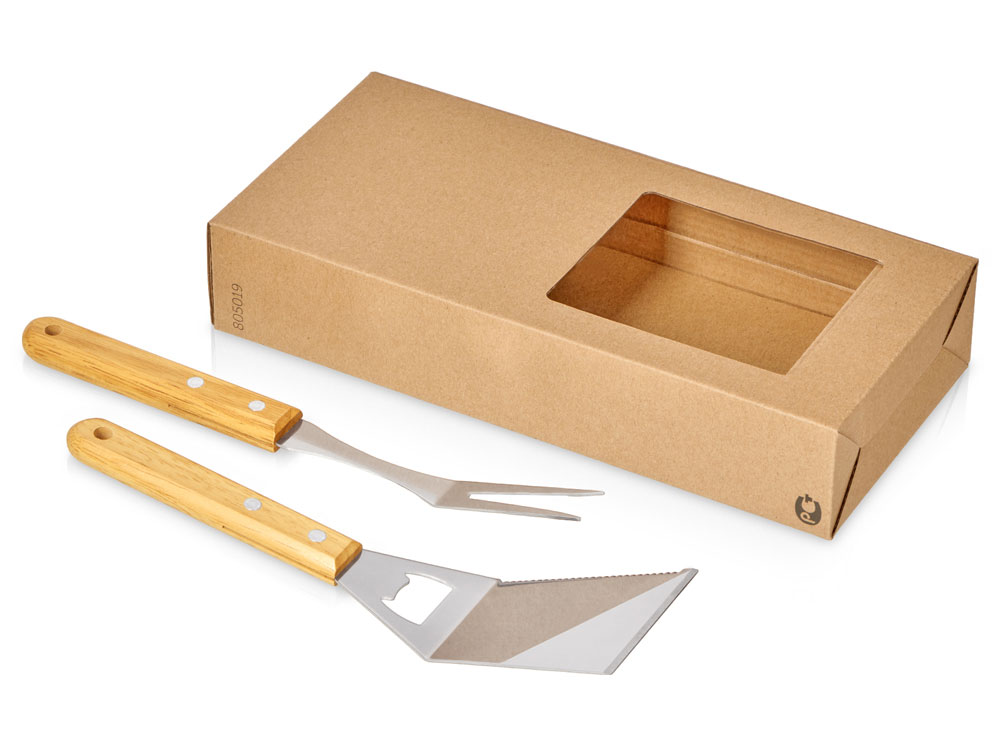 Набор аксессуаров для барбекю Grill Master с деревянными ручками состоит из двух предметов: лопатки и вилки. Лопатка также имеет дополнительную функцию - открывалки для бутылок. Набор поставляется в крафтовой коробке с окошком.