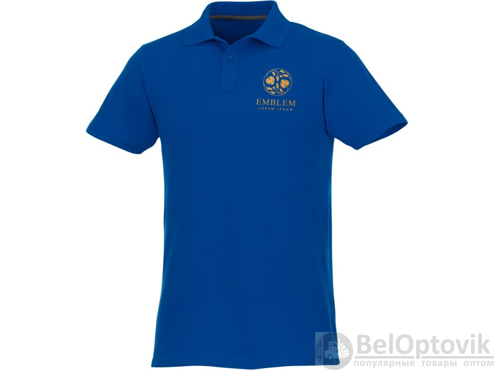 Мужское поло Helios с коротким рукавом. Отрезной-отрывной ярлык для комфорта. Воротник гладкой вязкой в рубчик. Планка с двумя пуговицами. Двойная строчка на воротнике и внизу изделия. Пуговицы в цвет изделия. Полоска на горловине в контрастном цвете. Трикотаж Piqué, 100 % хлопок. 180 г/м².