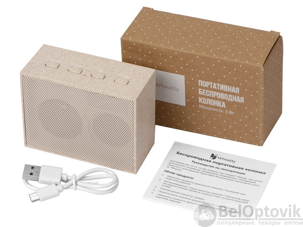 Беспроводная колонка Wheatty на 35% состоит из переработанной пшеничной соломы, что является положительным примером сокращения производства и потребления пластика в мире. Воспроизводит музыку в течение 3-х часов. Мощность 3 Вт. В колонке предусмотрены кнопки управления и линейный вход (AUX). Компактная колонка с быстрым подключением (Bluetooth 5.0). Поставляется в крафт упаковке из переработанной бумаги.
