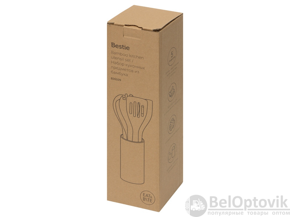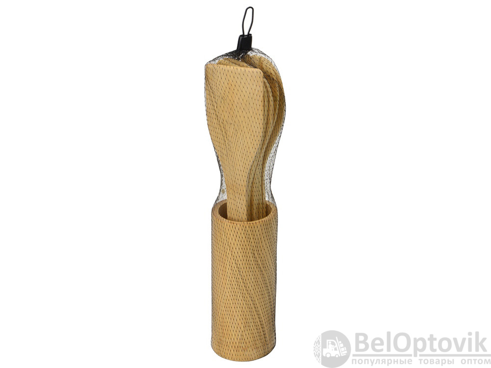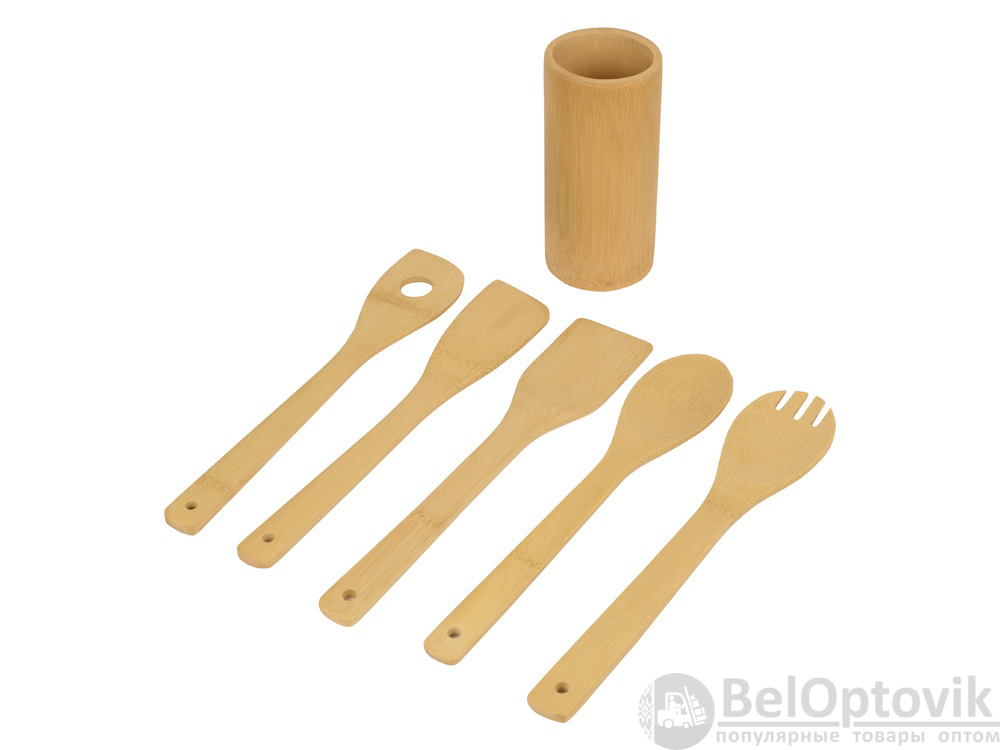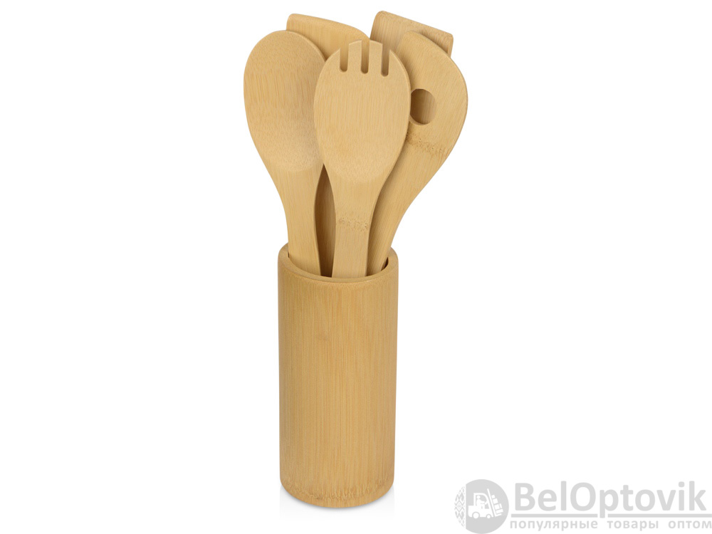 В набор входят лопатки и ложки, необходимые для приготовления различных блюд. С помощью удобной подставки из бамбука, которая идет в комплекте, принадлежности всегда будут под рукой.