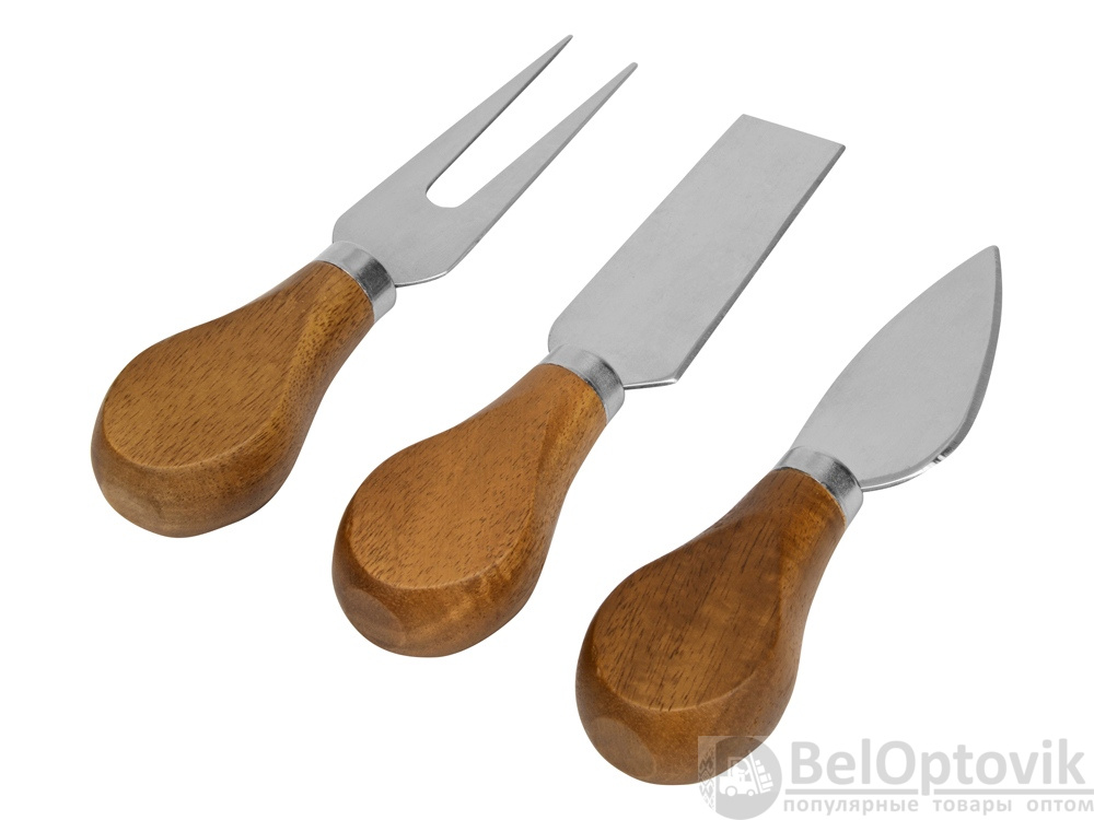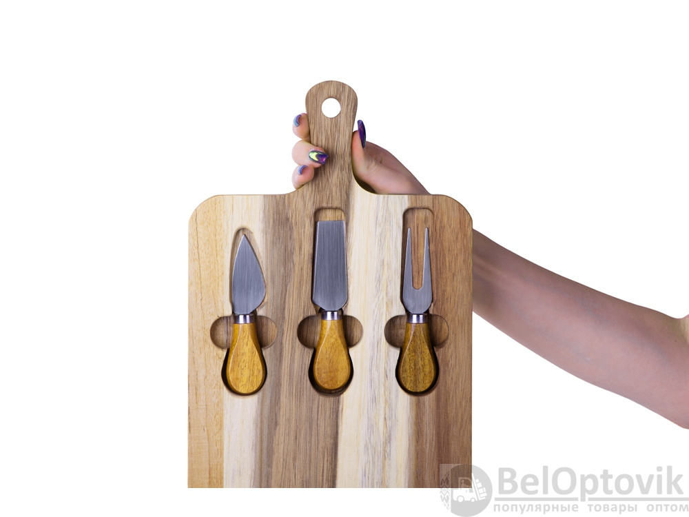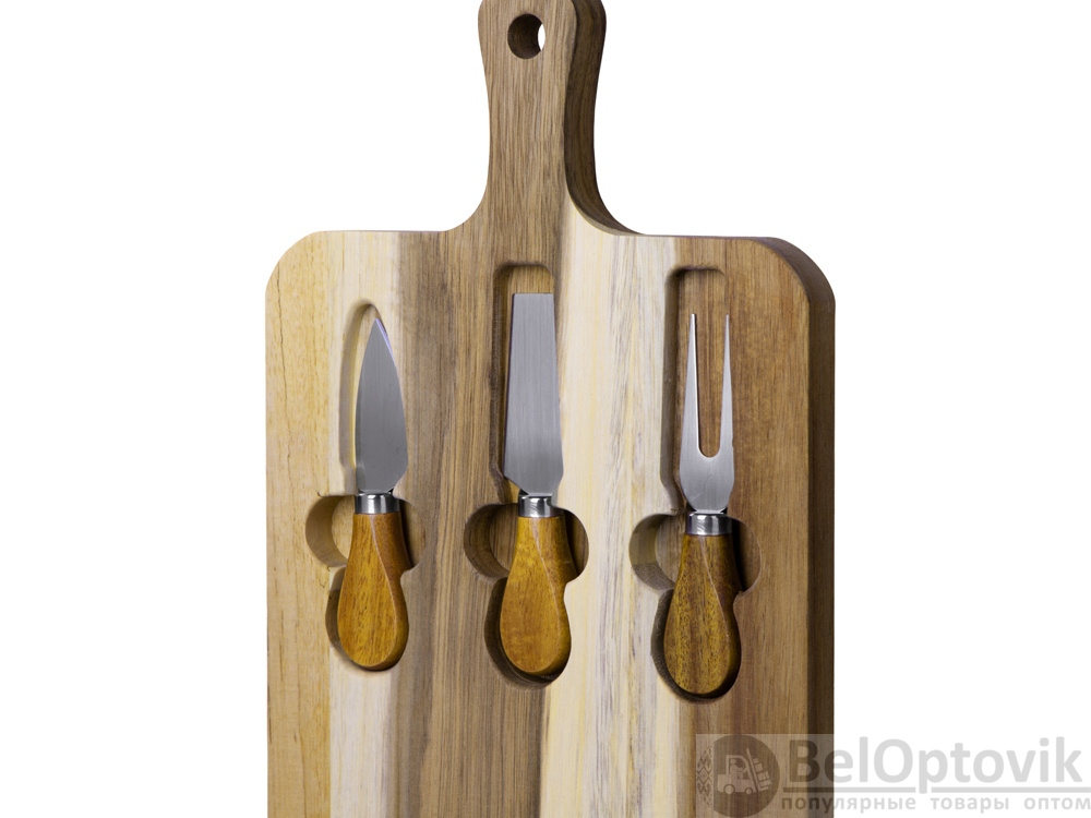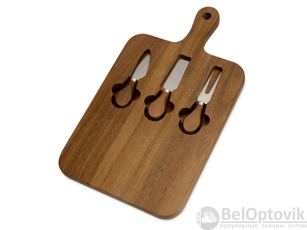 - Комплектность: разделочная доска 21,5 х 37,3 х 2 см, нож листовидный 11,2 см, нож-лопатка для мягкого сыра 12,2 см, вилка 12,3 см