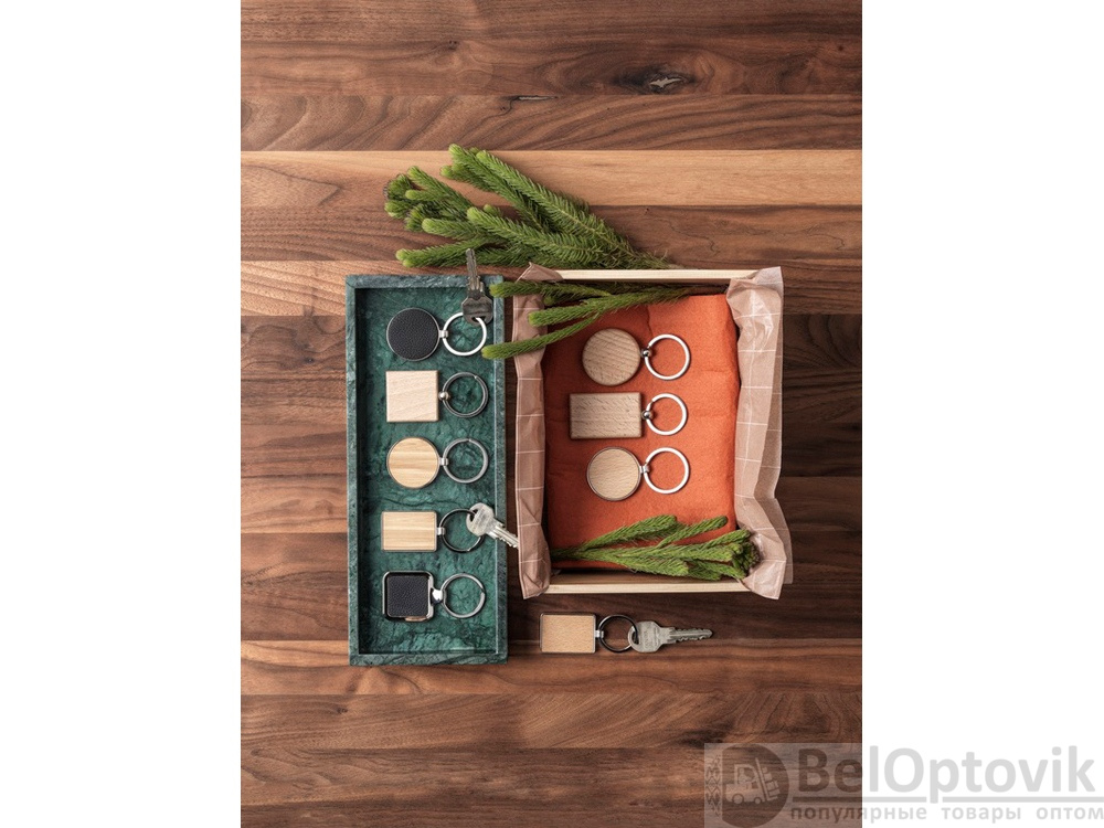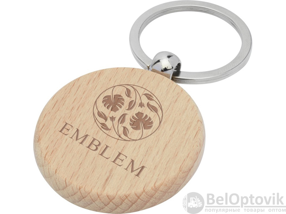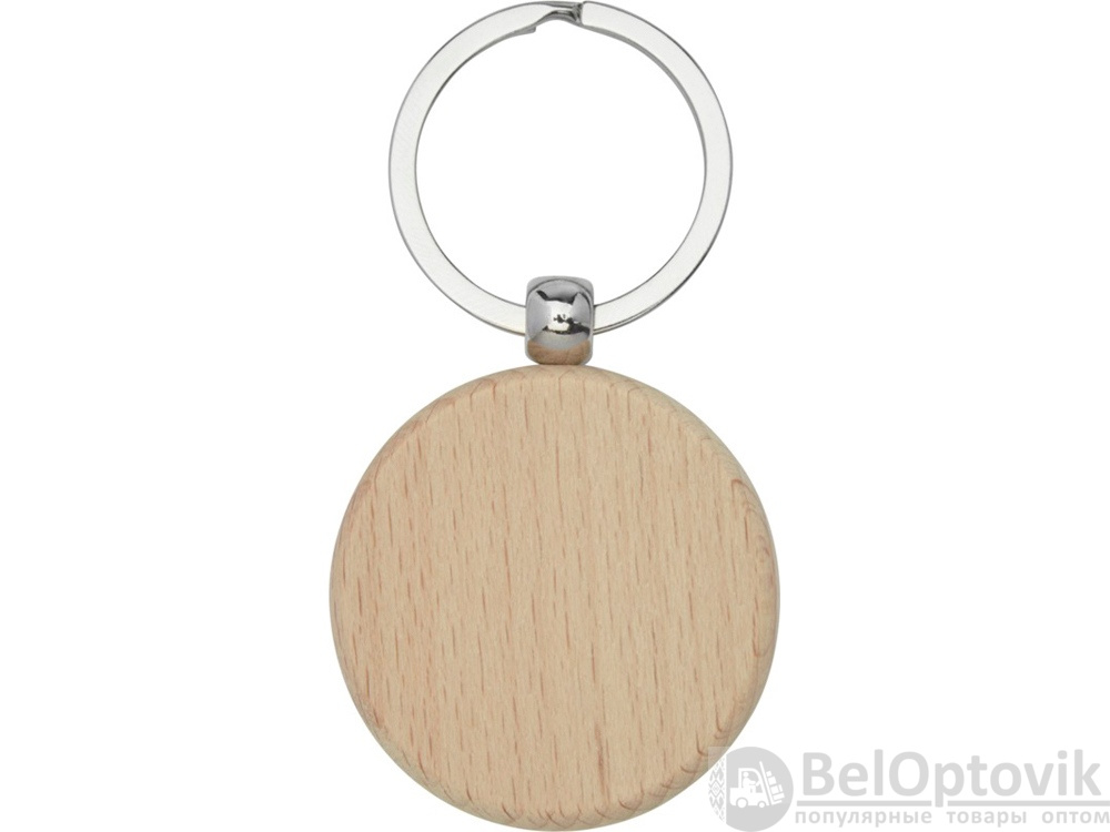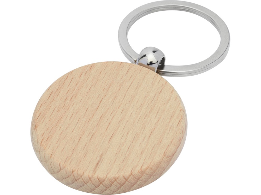 Круглый брелок из буковой древесины. Поставляется в коричневой упаковке из шрифтовой бумаги.