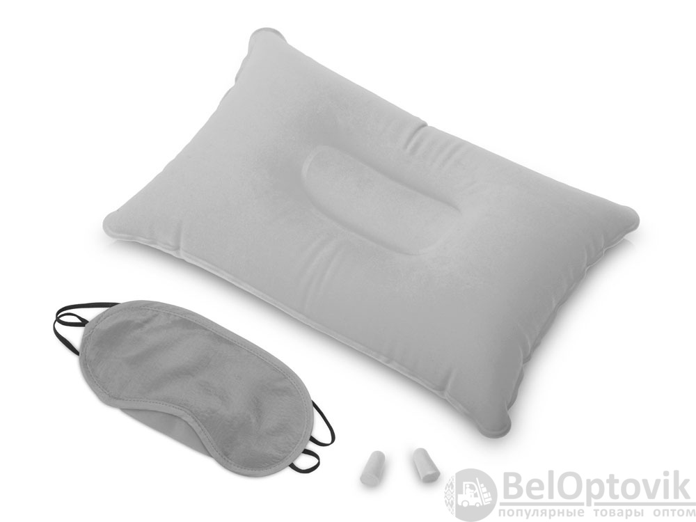 Путешествуйте с комфортом вместе с дорожным набором Cloud, который включает в себя подушку из ПВХ прямоугольной формы, повязку на глаза и полиуретановые беруши.