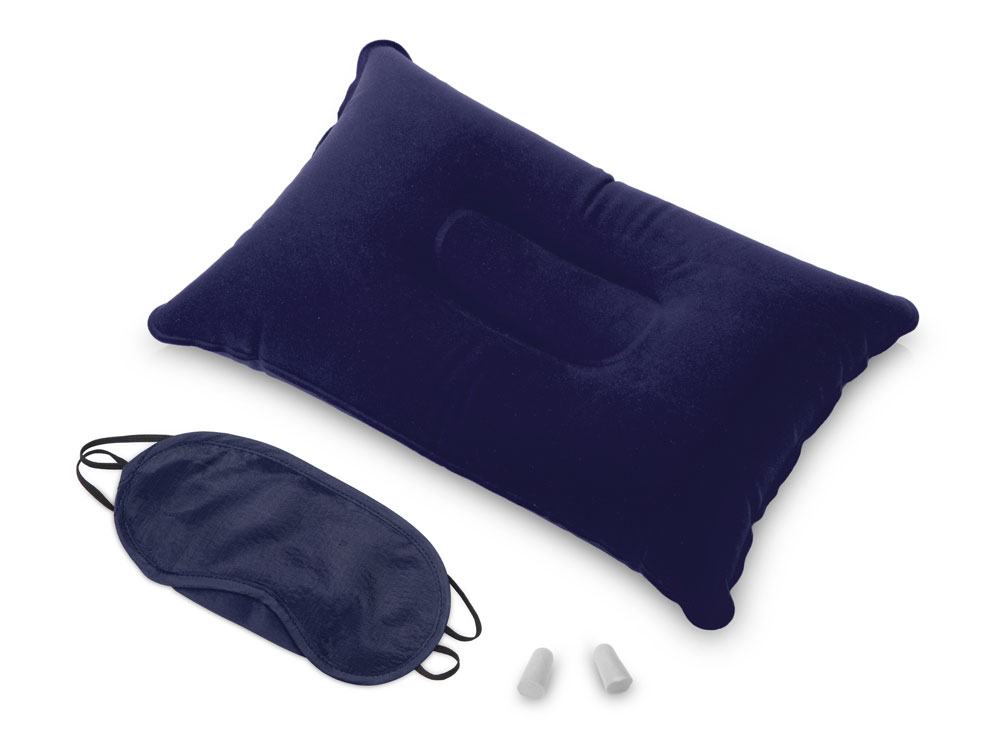 Путешествуйте с комфортом вместе с дорожным набором Cloud, который включает в себя подушку из ПВХ прямоугольной формы, повязку на глаза и полиуретановые беруши.