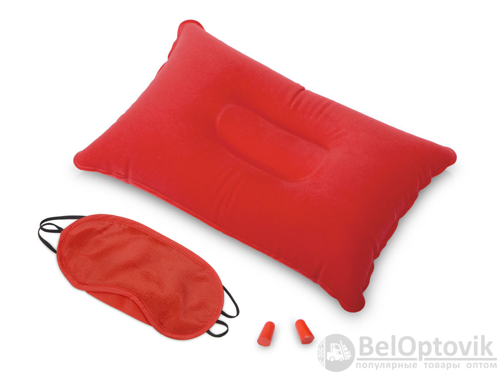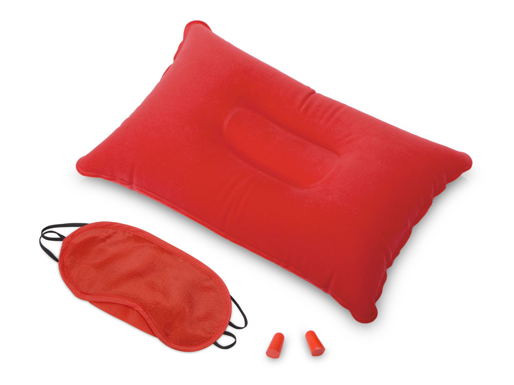 Путешествуйте с комфортом вместе с дорожным набором Cloud, который включает в себя подушку из ПВХ прямоугольной формы, повязку на глаза и полиуретановые беруши.