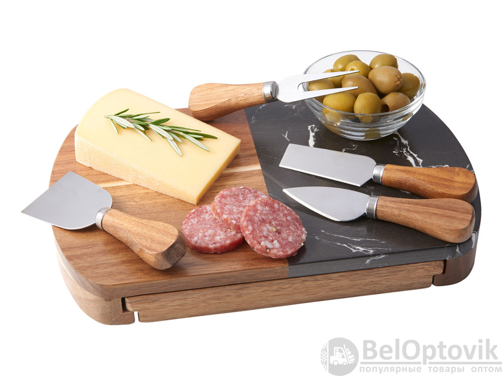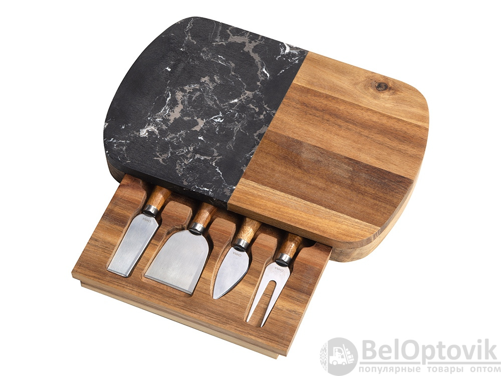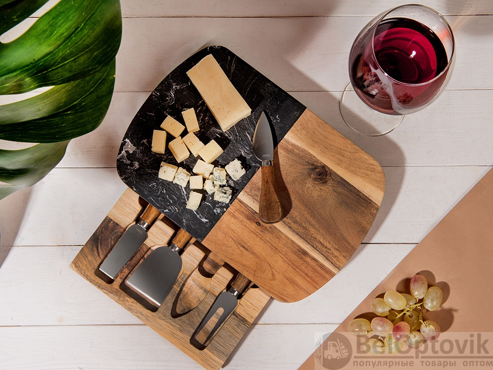 Этот роскошный набор для сыра идеально подходит на роль подарка для любого торжественного случая. Набор изготовлен из черного мрамора и акации: каменная вставка на крышке выполняет не только декоративную, но и практическую функцию, ведь на ней очень удобно резать и раскладывать сыр. Инструменты для резки сыра хранятся в выдвижном ящике под крышкой, для каждого из приспособлений предусмотрена своя вырубленная ниша. Из-за особенностей материала возможны вариации рисунка мрамора и дерева, что может отразиться на выгравированном изображении.