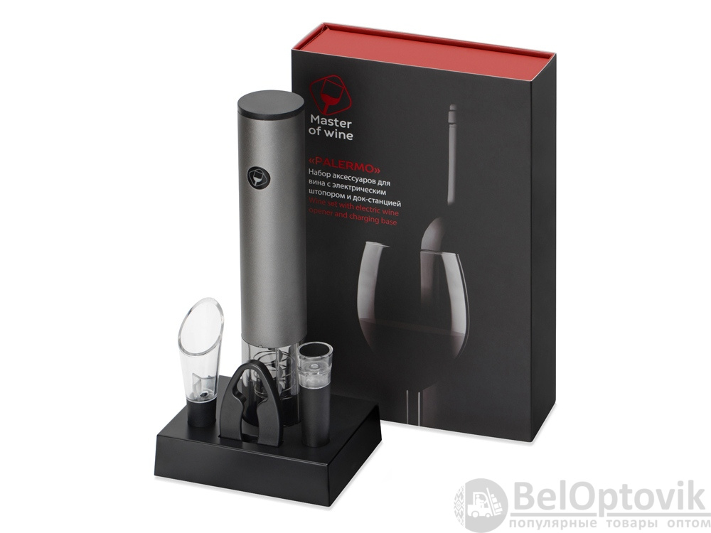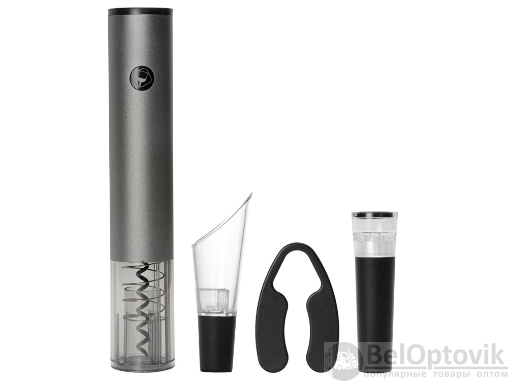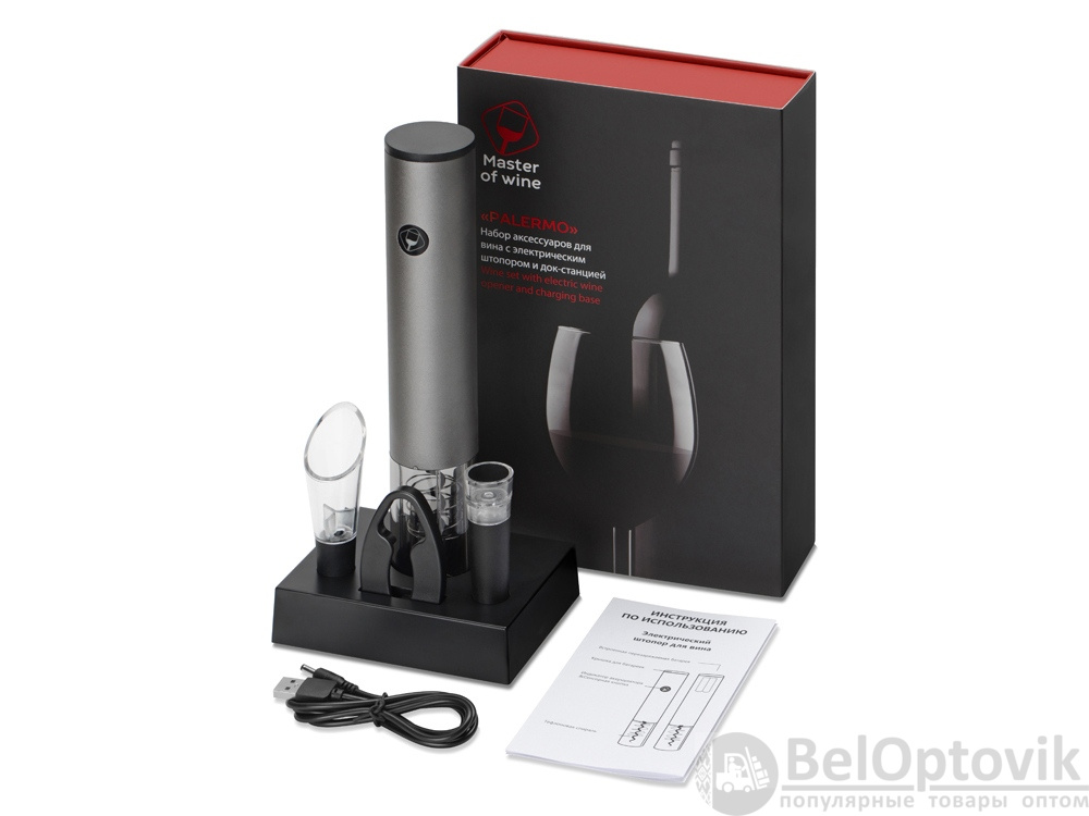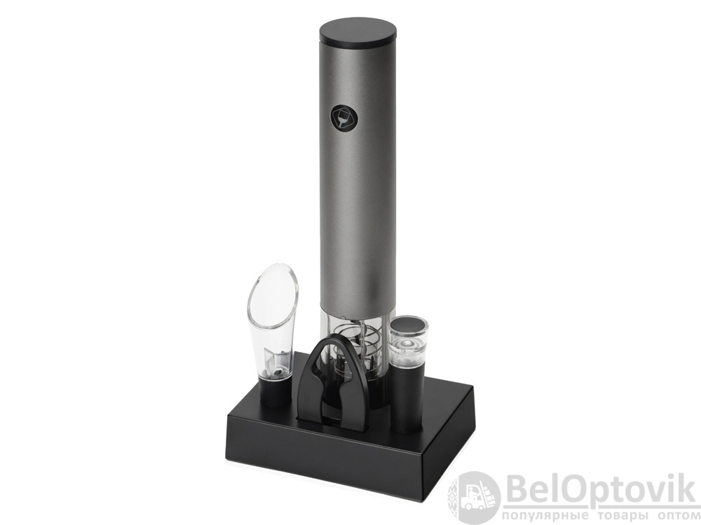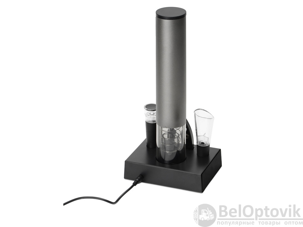 - Комплектность: электрический штопор d4,5 х 25,3 см, док-станция 12,7 х 9,3 х 3 см, нож для фольги, аэратор, вакуумная пробка, кабель USB, батарейка AA- 4 шт.