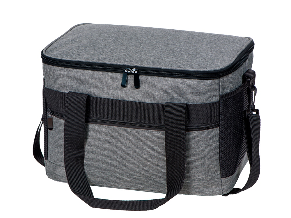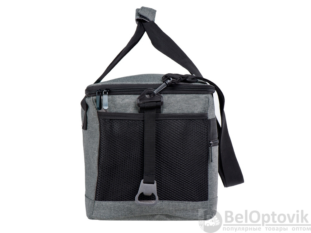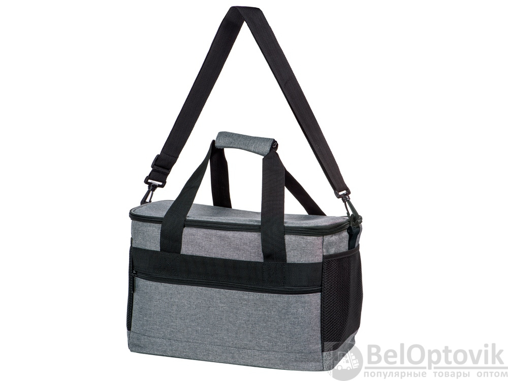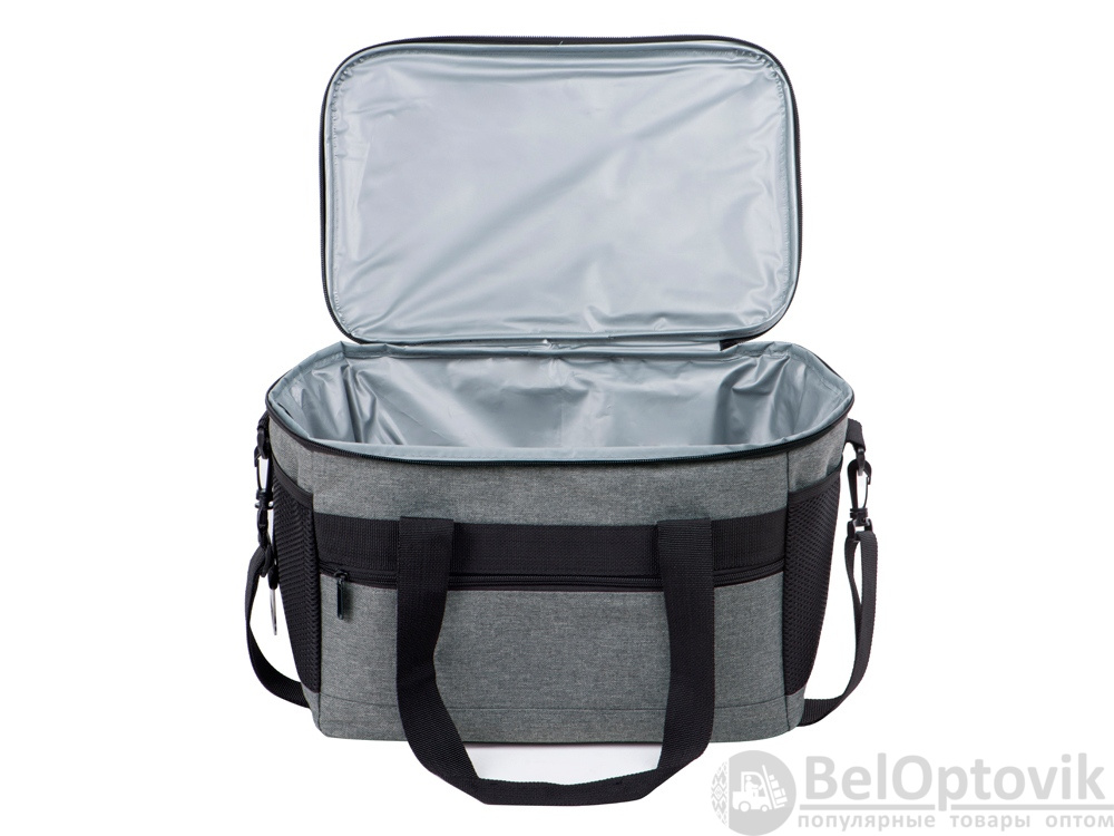 Вместительная сумка-холодильник со специальной конструкцией дна, предотвращающей протекание наружу жидкости от размораживания. Поверхность сумки всегда остается сухой. Основное отделение и карман спереди на молнии. Сбоку 2 сетчатых кармана. Съемный плечевой ремень регулируется по длине. Короткие ручки фиксируются вместе застежкой-липучкой. В комплекте открывалка для бутылок.