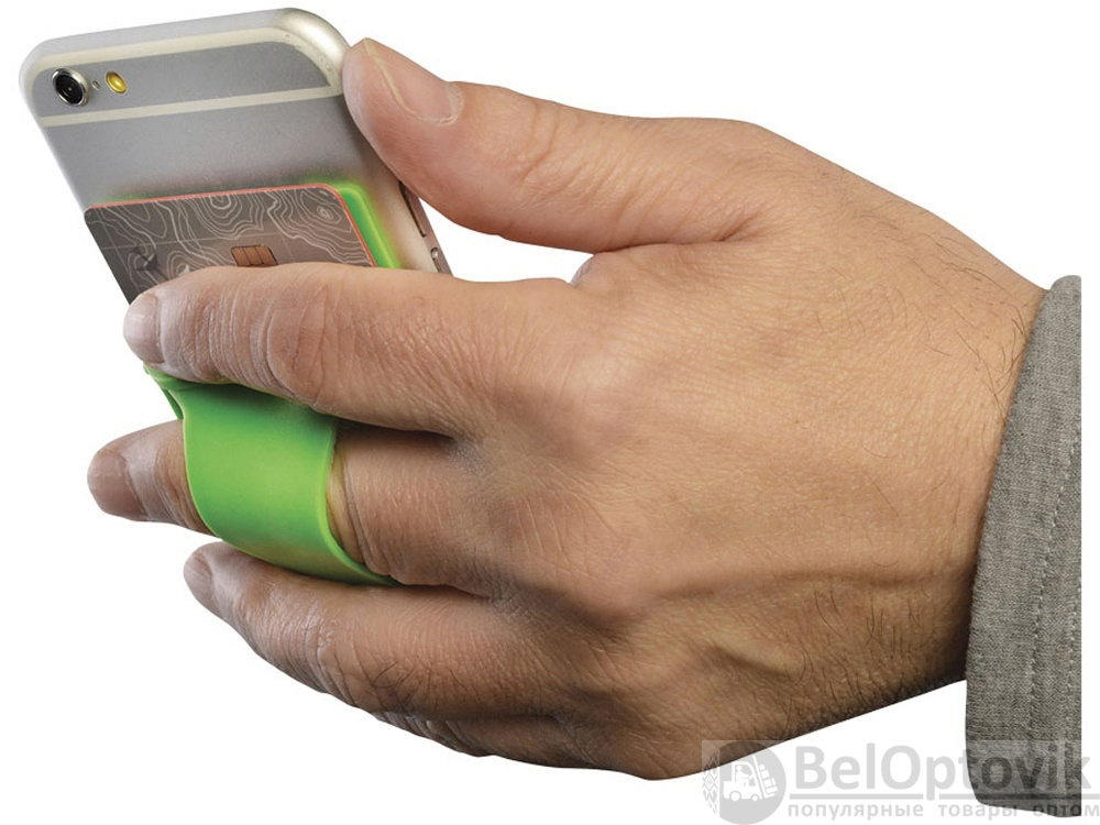 Силиконовый картхолдер для телефона с отверстием для пальца. Картхолдер можно легко прикрепить практически ко всем смартфонам с плоской панелью сзади при помощи липкой ленты. В него можно поместить кредитную карту/ идентификационную карту/ карту-ключ от номера / 5 визиток или банкноты. Отверстие для пальца для более удобного удержания телефона.