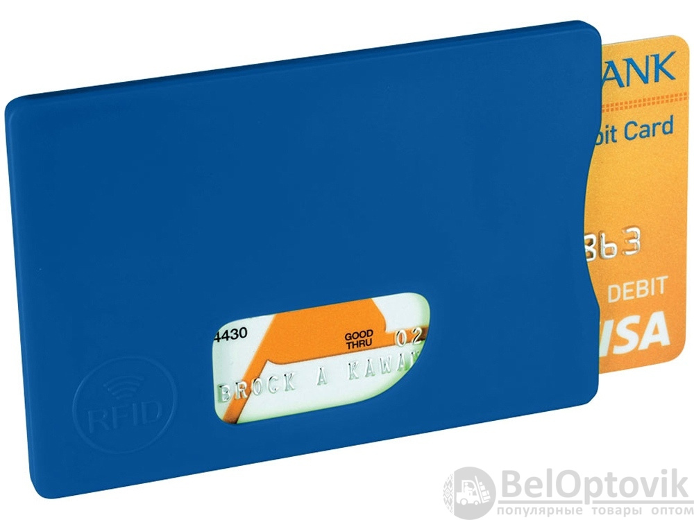 Защитный RFID чехол для кредитной карты. Благодаря RFID защите чехол надежно защитит вашу карту от несанкционированных транзакций. Чехол достаточно тонкий, так что вы можете держать его в бумажнике, сумочке или в кармане. Большое место для нанесения. Пластик.