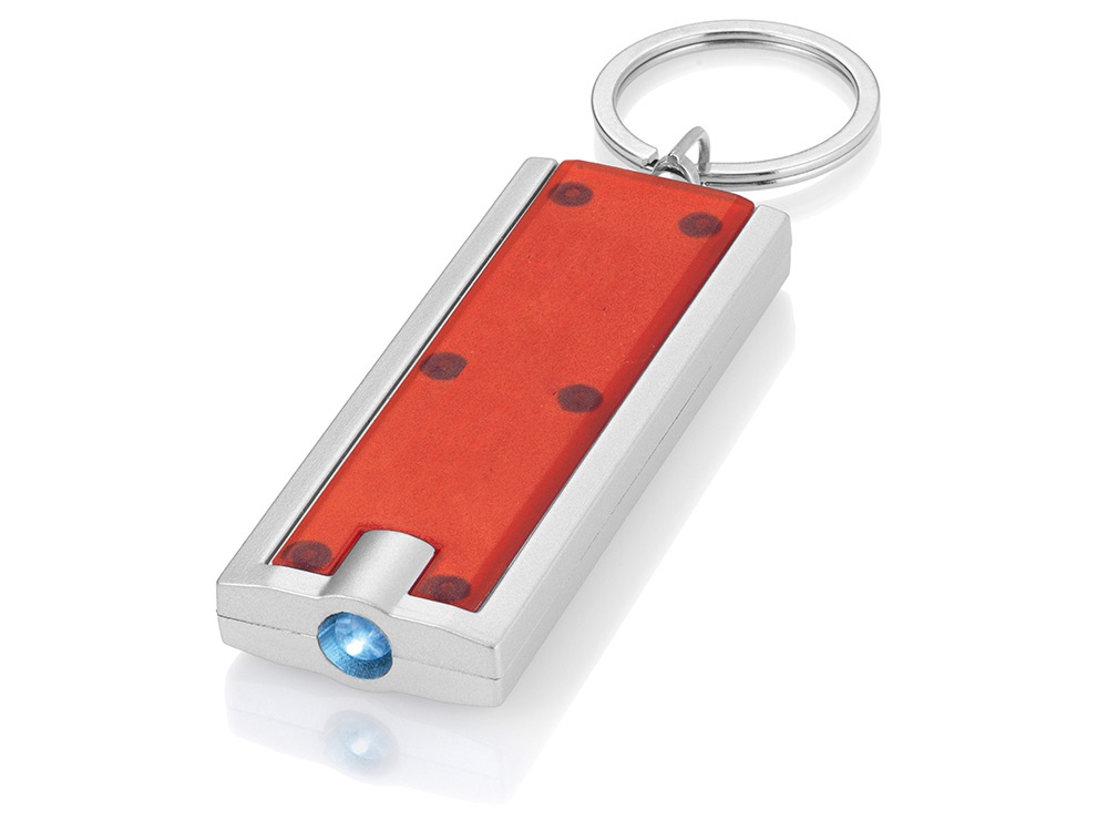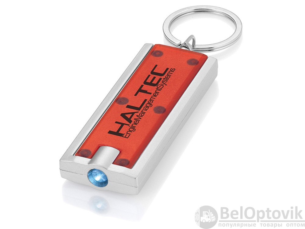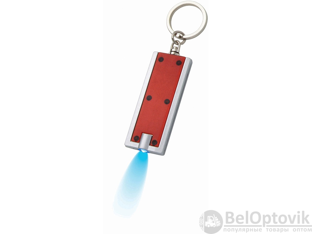 Брелок с ярким светодиодным фонариком с кнопкой. Металлическое кольцо для ключей. Батарейки включены в комплект. АБС-пластик.