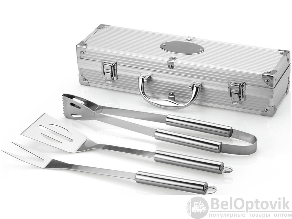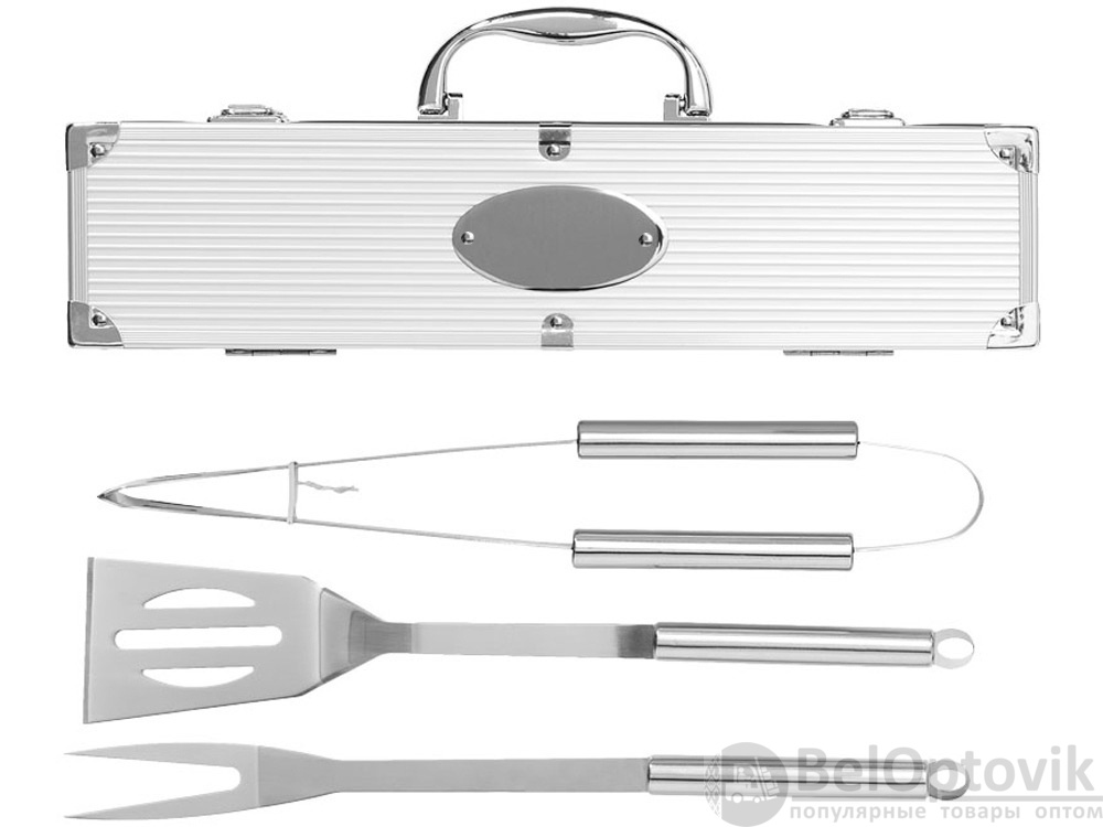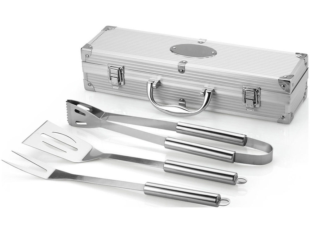 Набор для барбекю 3 предмета. Лопатка, щипцы и вилка в кейсе. На алюминиевом кейсе имеется шильд для персонализации.