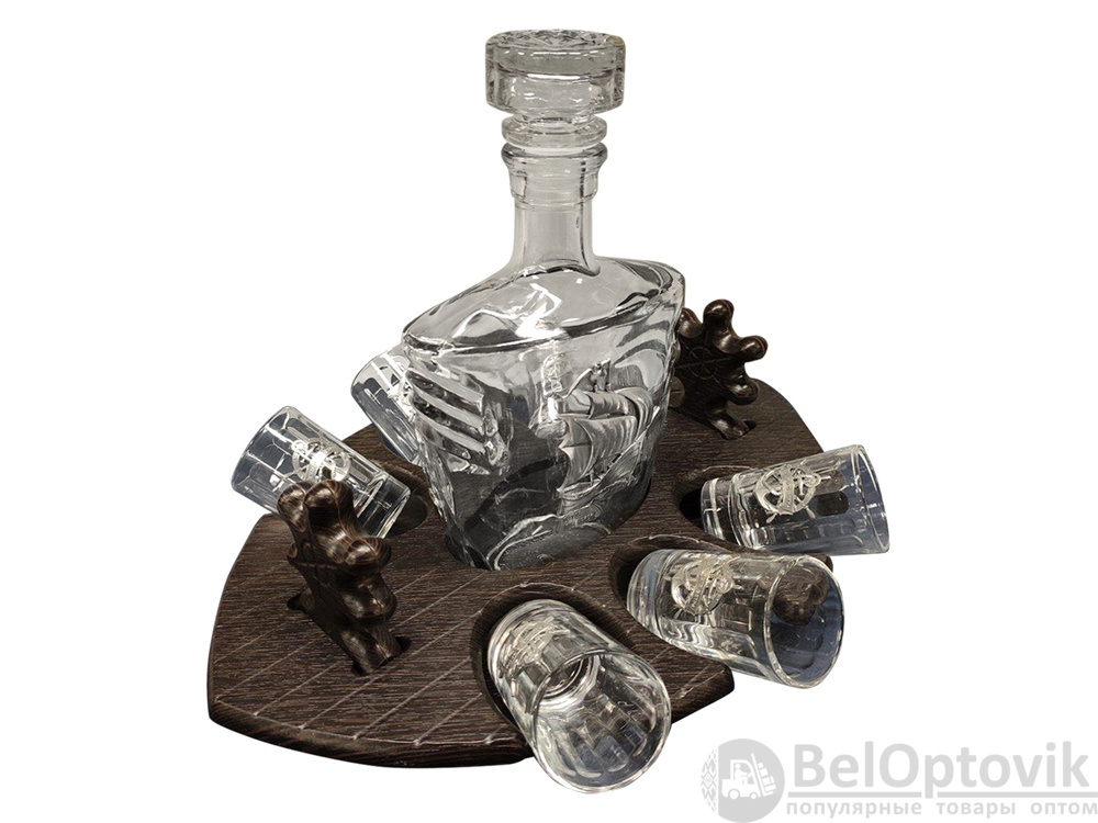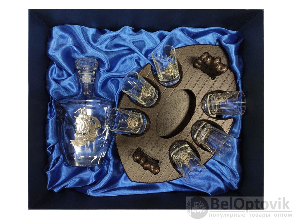 Набор для водки со штофом. В набор входит штоф 0.5 л с оловянным барельефом, шесть стопок 60 мл с оловянным барельефом и подставка мини-бар в форме корабля.