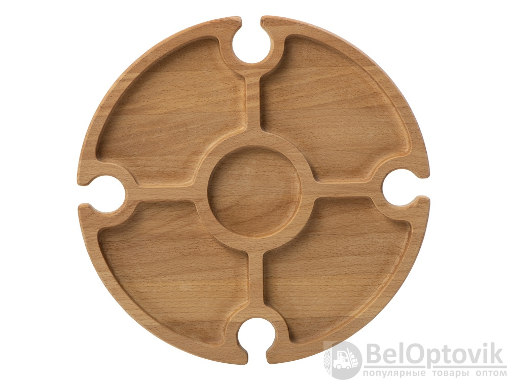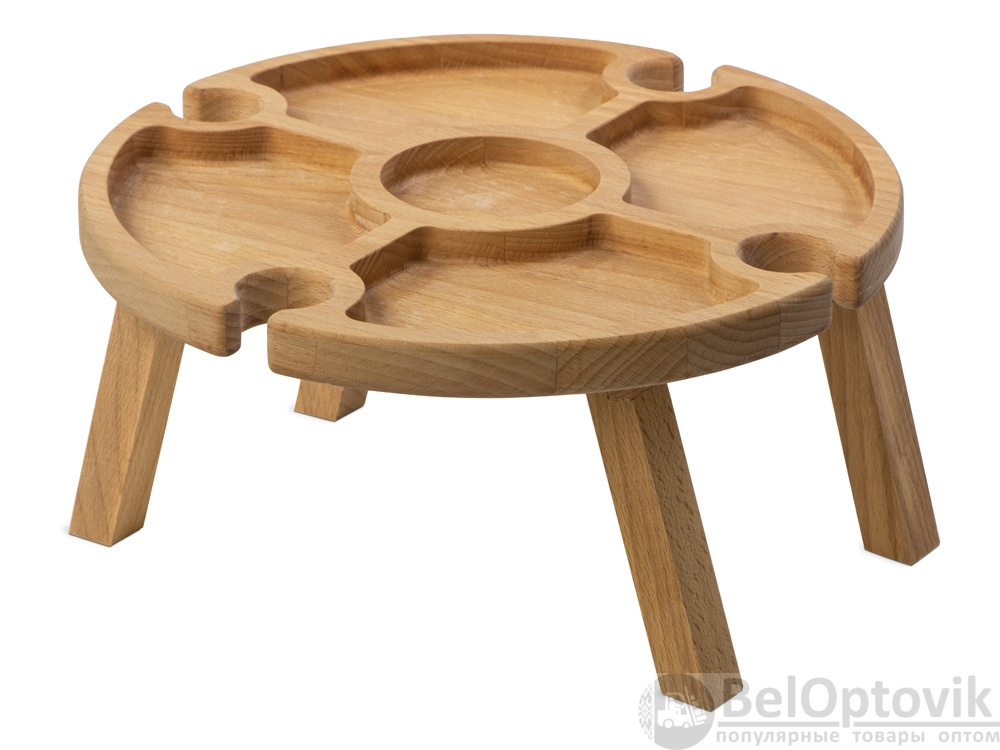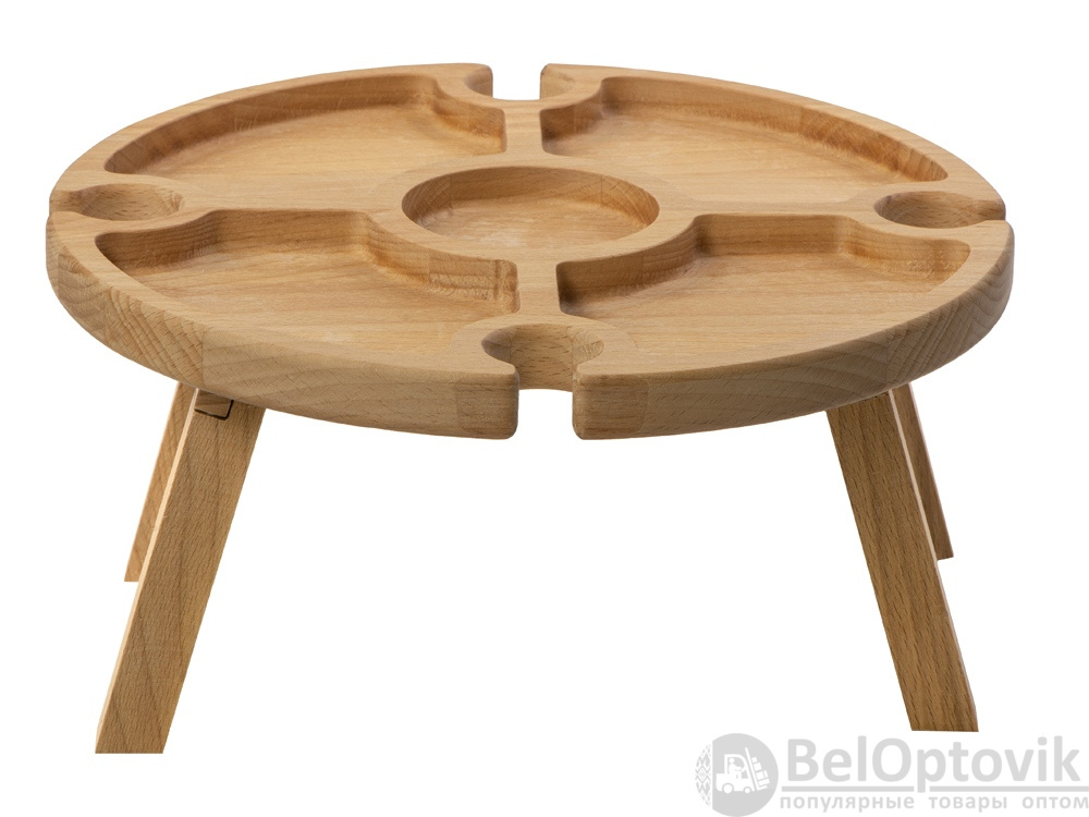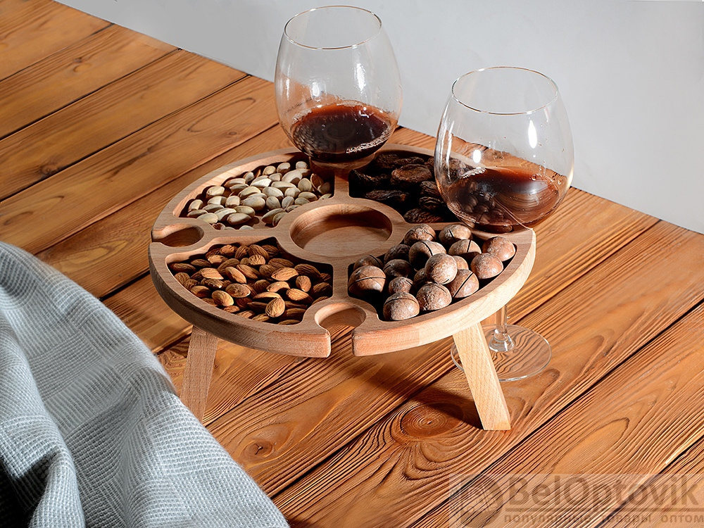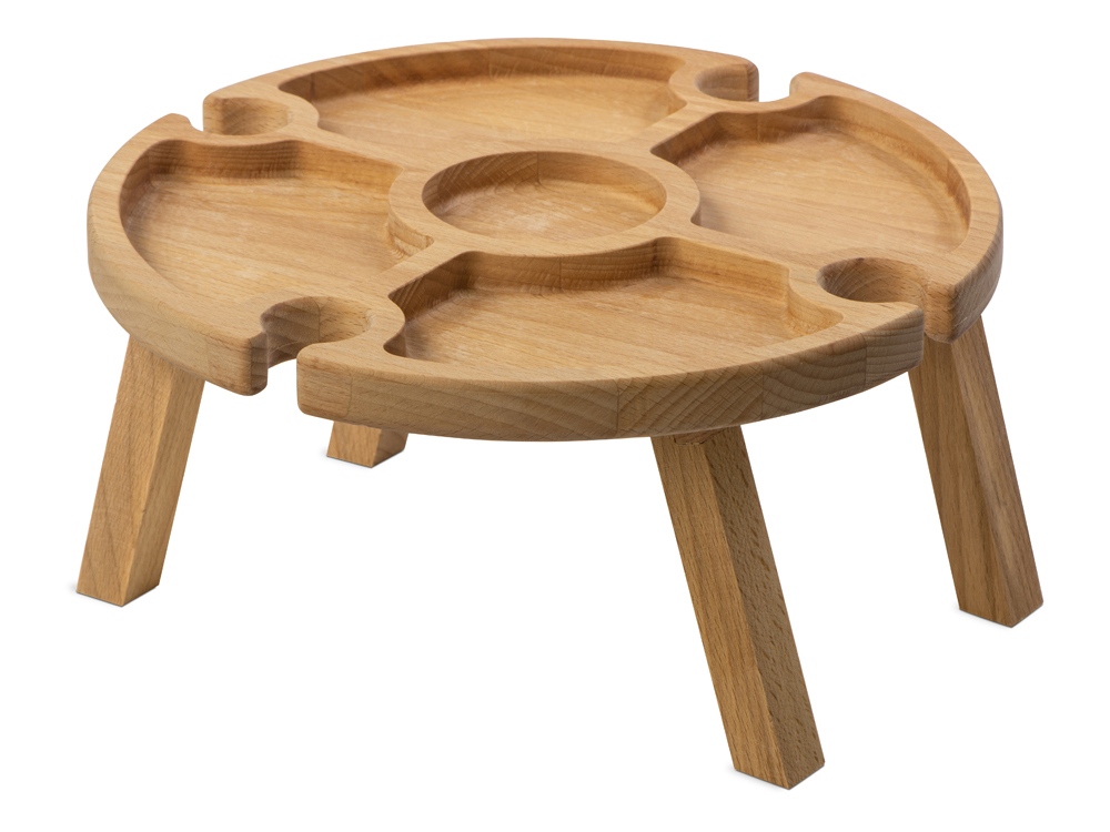 Деревянный столик на складных ножках может быть использован как во время пикников на открытом воздухе, так и дома, где его можно использовать прямо на полу. Столик позволяет подать 4 вида различных закусок, не смешивая их, благодаря четырем сепарированным секциям, в которые можно поместить ягоды, орехи и другие снеки, желательно, сухие либо подающиеся в масле (оливки, маслины). Четыре держателя для бокала особенно актуальны во время отдыха на природе, где каждый участник пикника обязательно оценит возможность зафиксировать посуду для вина.