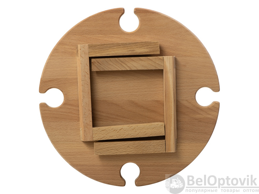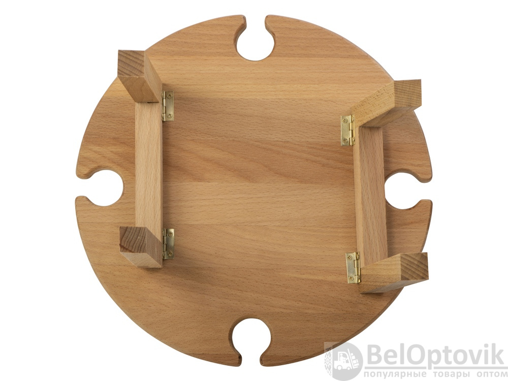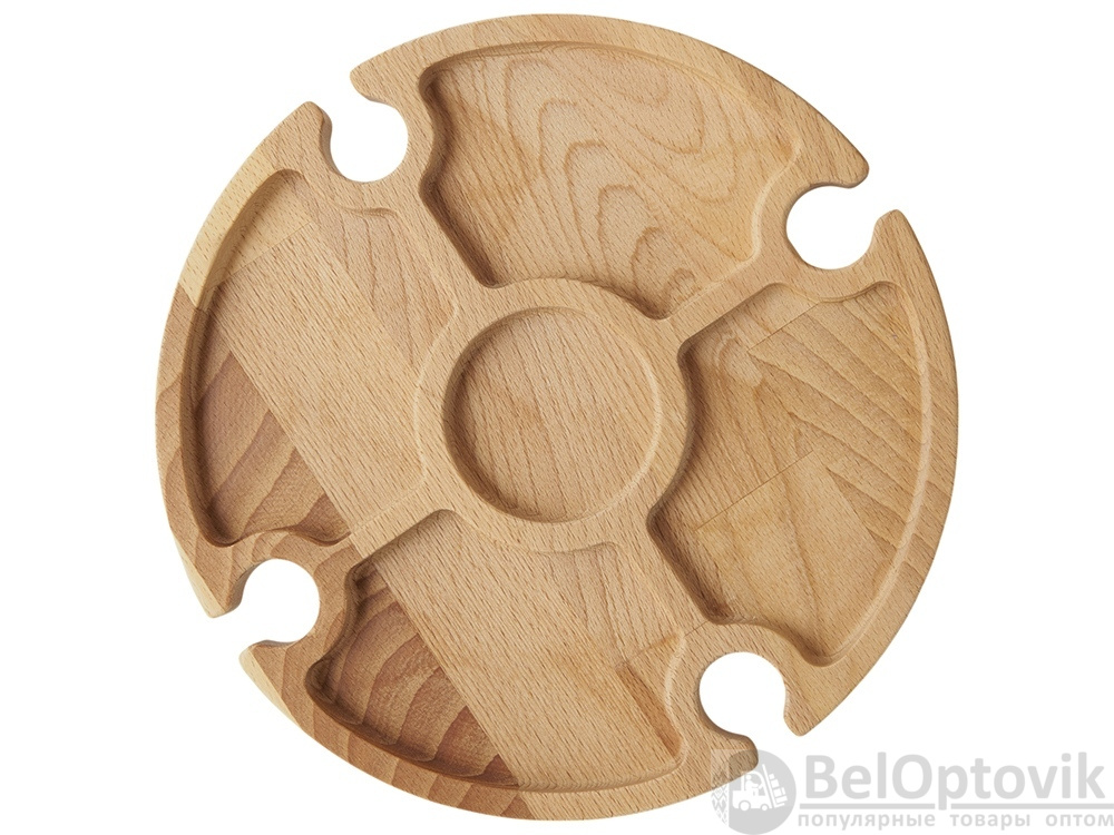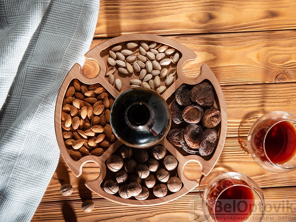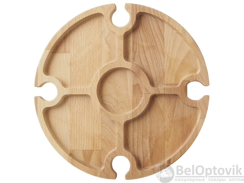 Деревянный столик на складных ножках может быть использован как во время пикников на открытом воздухе, так и дома, где его можно использовать прямо на полу. Столик позволяет подать 4 вида различных закусок, не смешивая их, благодаря четырем сепарированным секциям, в которые можно поместить ягоды, орехи и другие снеки, желательно, сухие либо подающиеся в масле (оливки, маслины). Четыре держателя для бокала особенно актуальны во время отдыха на природе, где каждый участник пикника обязательно оценит возможность зафиксировать посуду для вина.