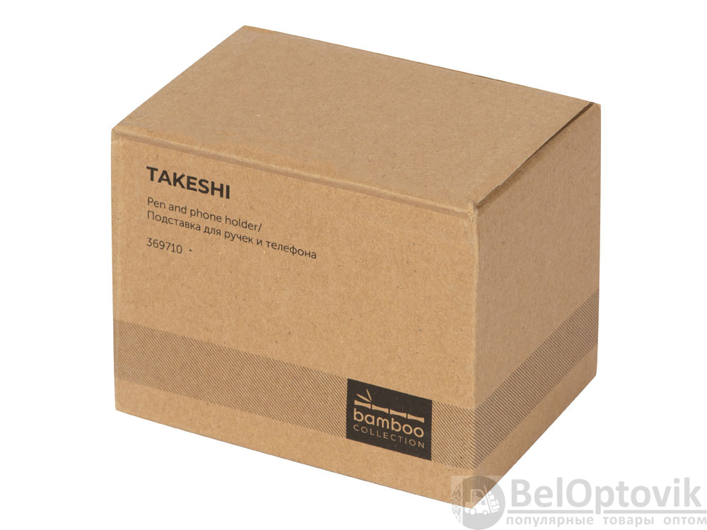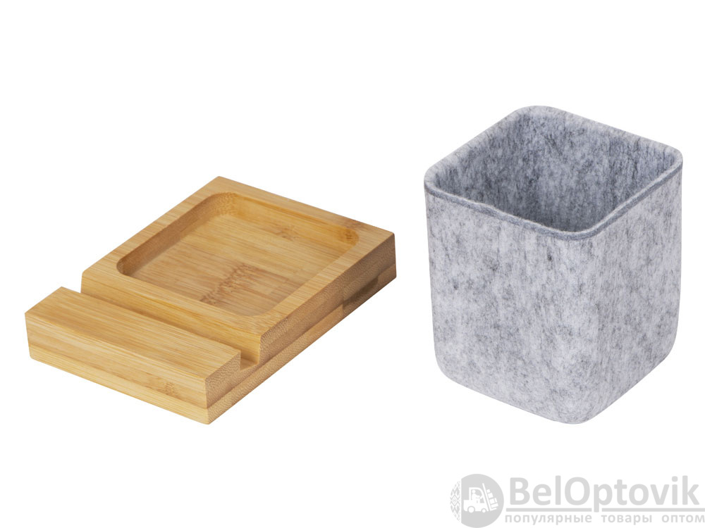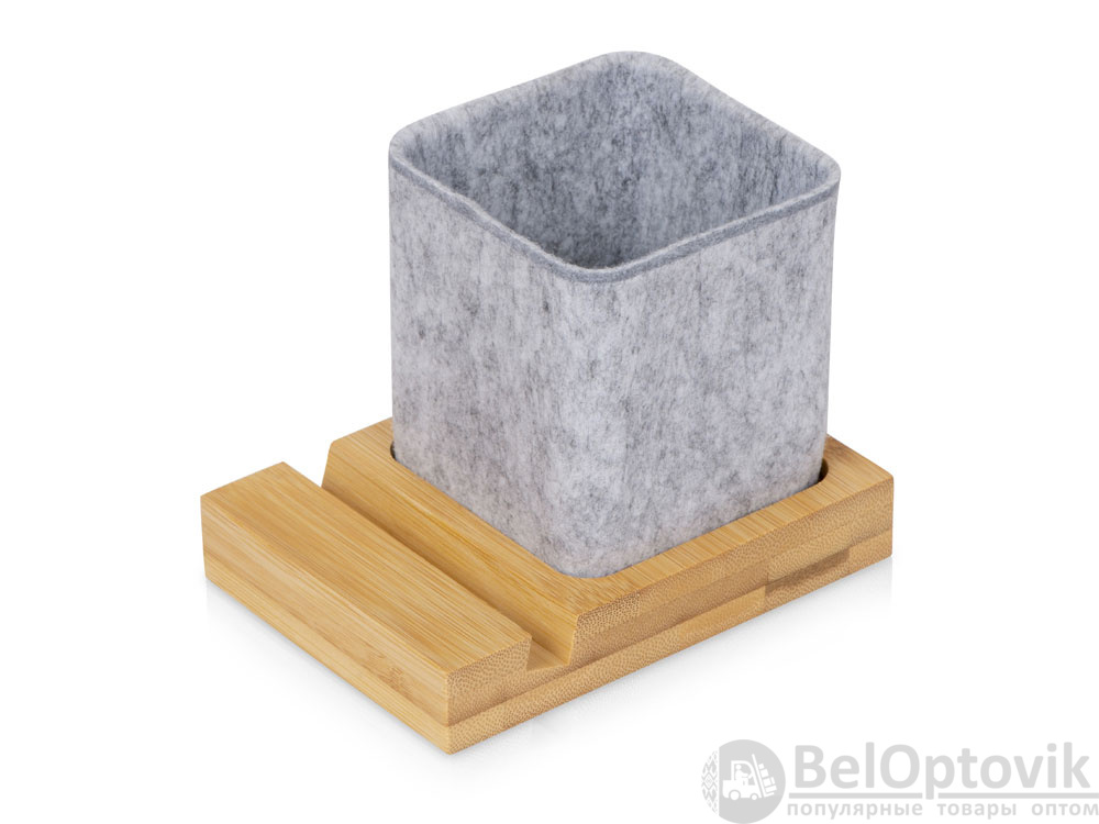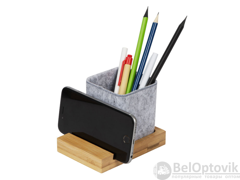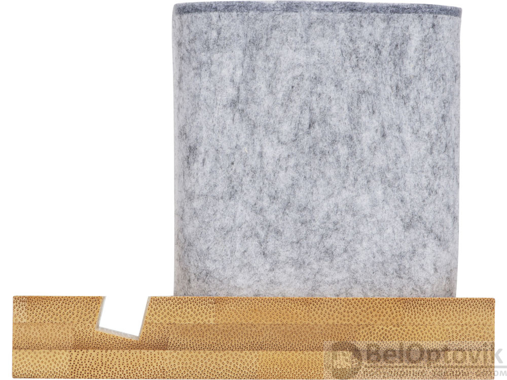 Подставка на рабочий стол для ручек и карандашей из RPET-фетра на подставке из бамбука. У бамбуковой подставки выемка 10 мм, в которую можно поставить телефон.