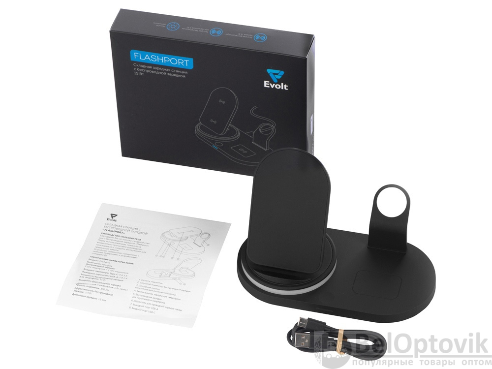 «Flashport» от Evolt - это складная зарядная станция с беспроводной зарядкой для телефона и наушников. В комплекте также идет подставка под зарядку для наручных смарт-часов. На регулируемой панели зарядки смартфона расположены 2 катушки (2 центра беспроводной зарядки), которые позволяют заряжать ваш девайс как в вертикальном, так и горизонтальном положении. Беспроводная зарядка для наушников мощностью 5 Вт подходит для зарядки не только беспроводных наушников, но и второго смартфона. Чтобы включить встроенную лампу, нажмите сенсорную кнопку 1 раз. Для плавного изменения яркости света нажмите и удерживайте сенсорную кнопку при включенной лампе. Кабель 100 см в комплекте.
