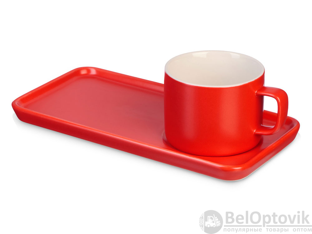 Чайная пара с необычным прямоугольным блюдцем — на нем хватит места не только для чашки, но и для пирожного. Весь силуэт этого комплекта — лаконичный, строгий, прямоугольный, что создает прекрасный фон для нанесения логотипа. Удобство этой чайной пары еще и в том, что для чашки предусмотрена отдельная ниша, которая не даст ей соскользнуть.