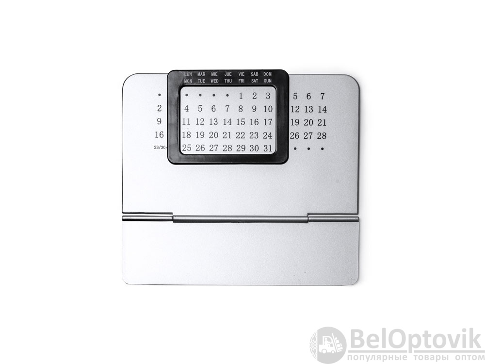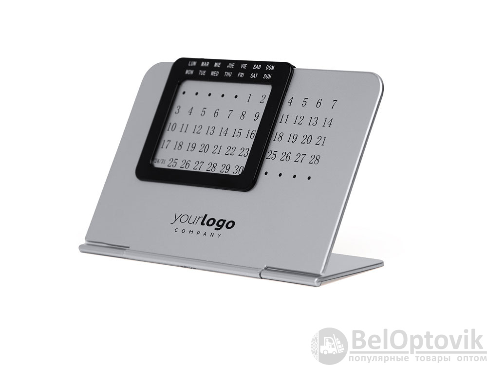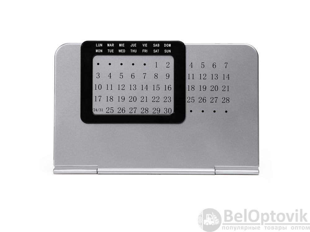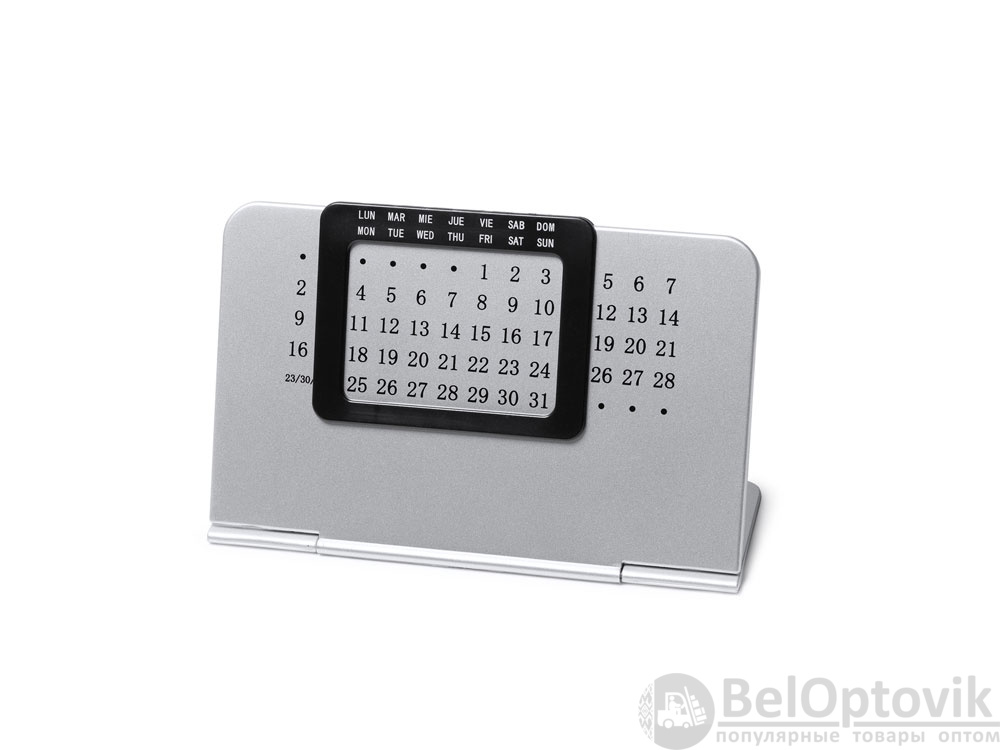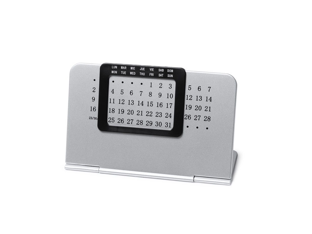 Вечный настольный календарь, состоящий из двух частей: одной серебряной подставки с числовой панелью и черной выдвижной рамки с днями недели на испанском и английском языках.