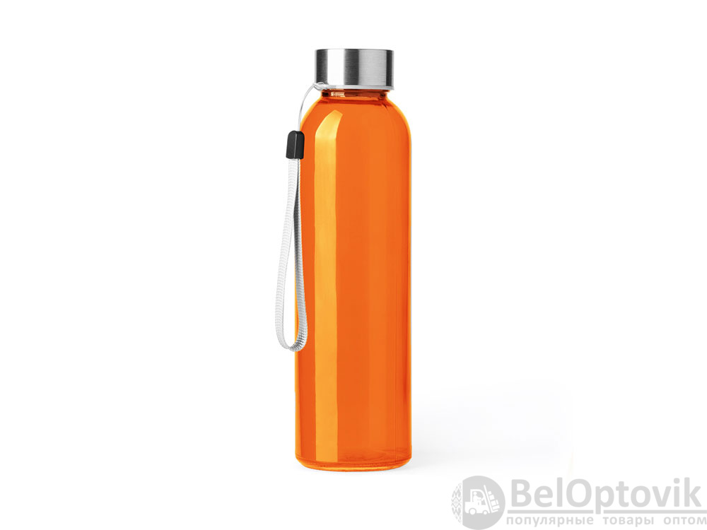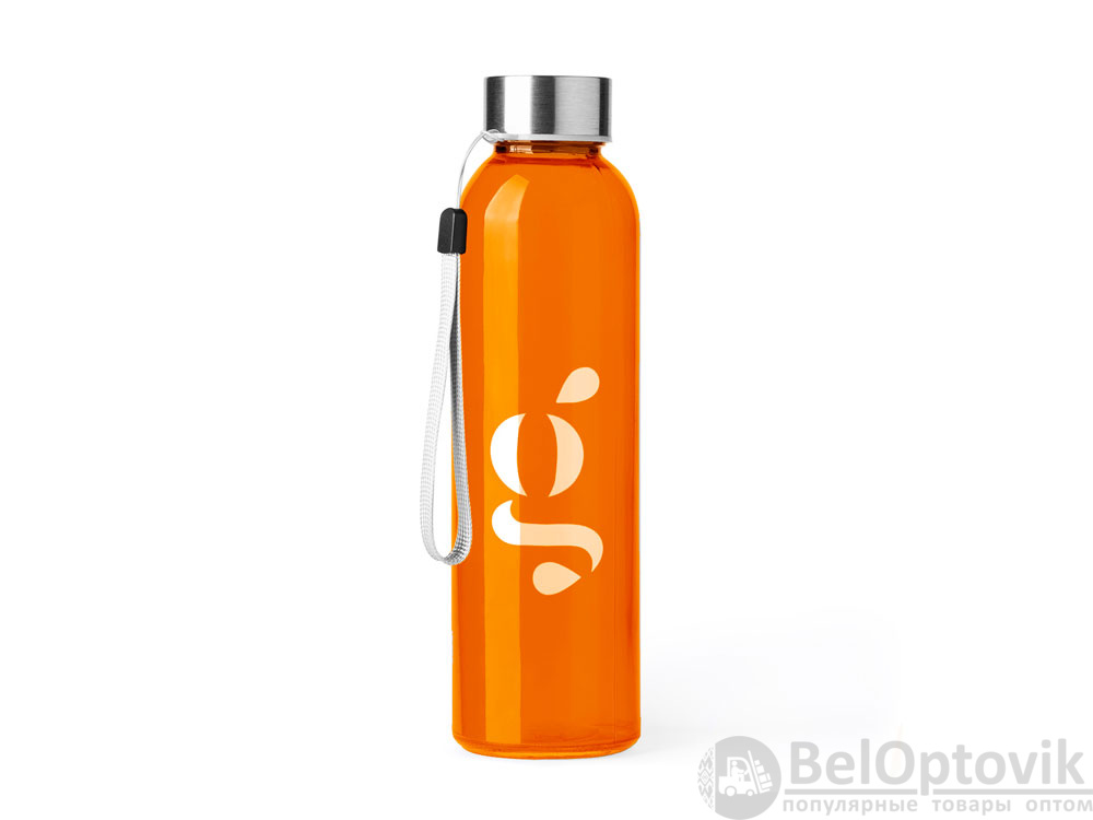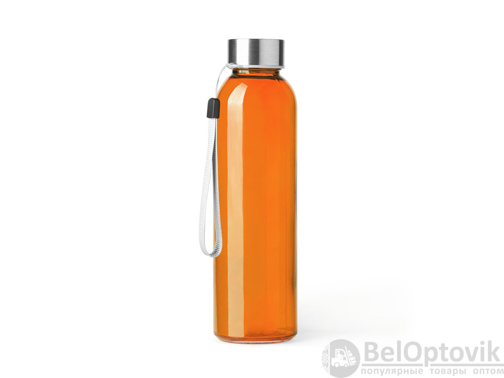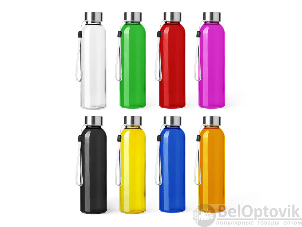 Стеклянная бутылка емкостью 500 мл. Большое разнообразие цветов, с завинчивающейся крышкой из нержавеющей стали и удобной для транспортировки благодаря ремешку серого цвета.