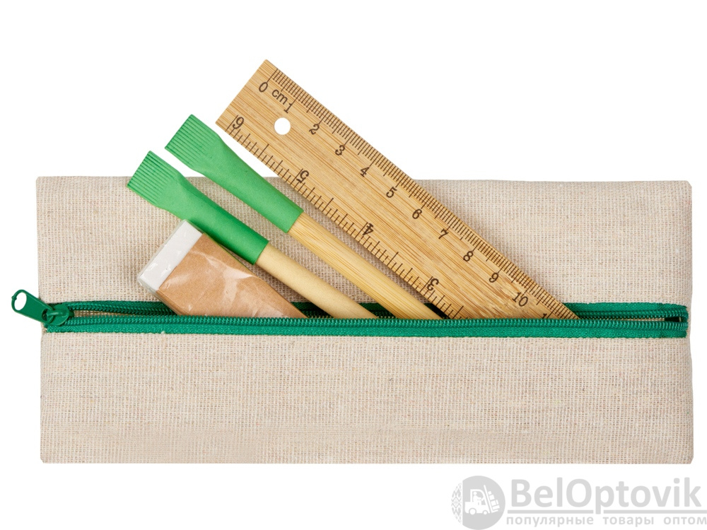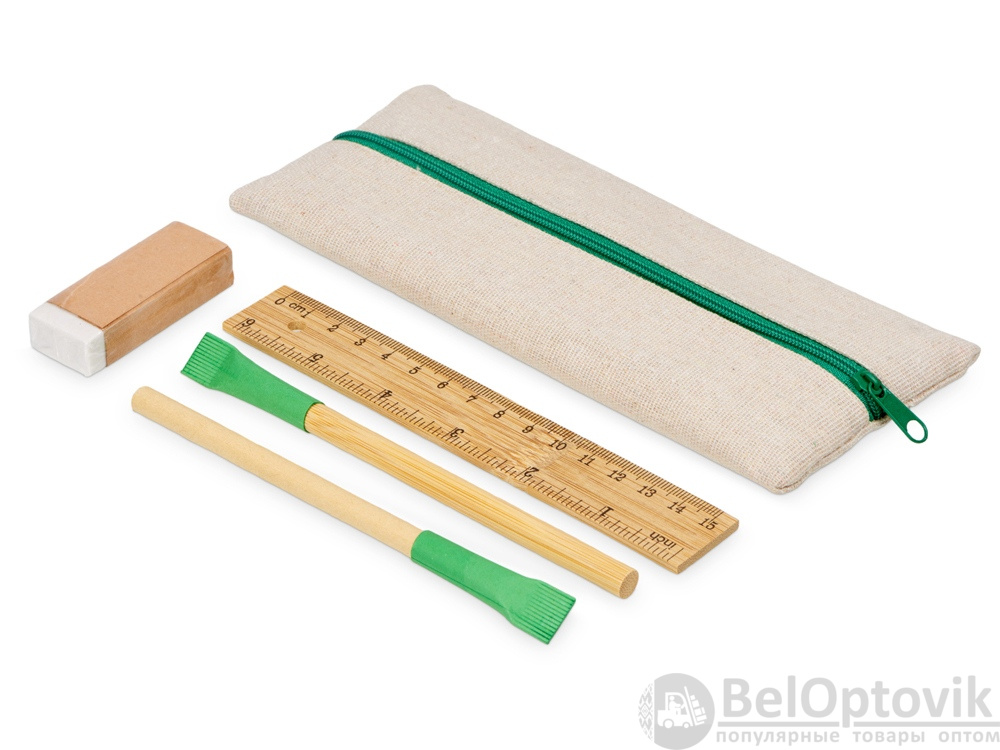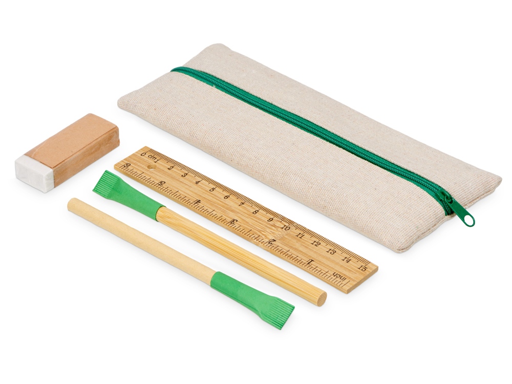 Удобный набор канцелярии со всем необходимым. В наборе: пенал на молнии, ручка Recycled, вечный карандаш в бамбуковом корпусе с колпачком из переработанной бумаги, ластик и бамбуковая линейка. Чтобы все самые необходимые пишущие принадлежности были под рукой.