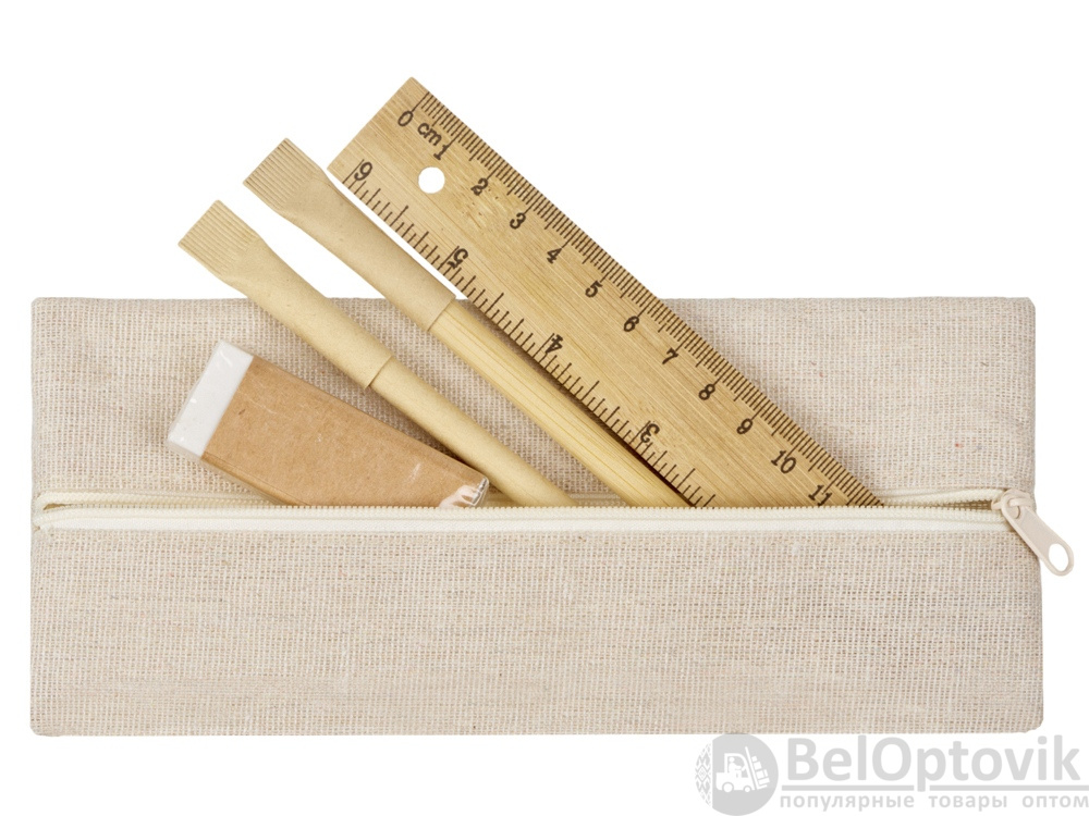 Удобный набор канцелярии со всем необходимым. В наборе: пенал на молнии, ручка Recycled, вечный карандаш в бамбуковом корпусе с колпачком из переработанной бумаги, ластик и бамбуковая линейка. Чтобы все самые необходимые пишущие принадлежности были под рукой.