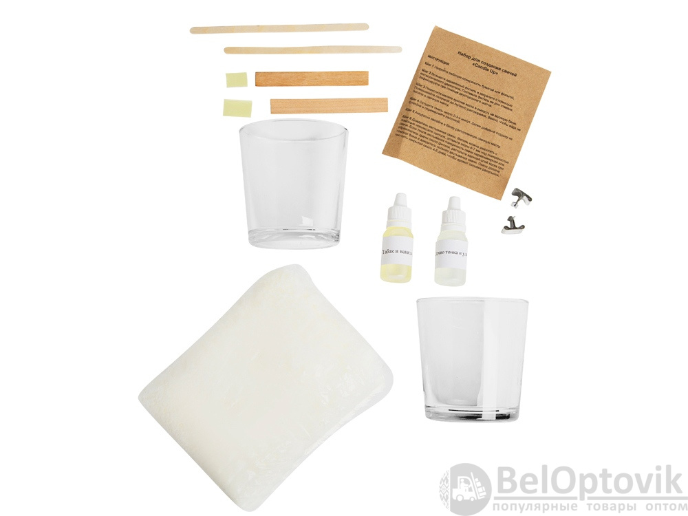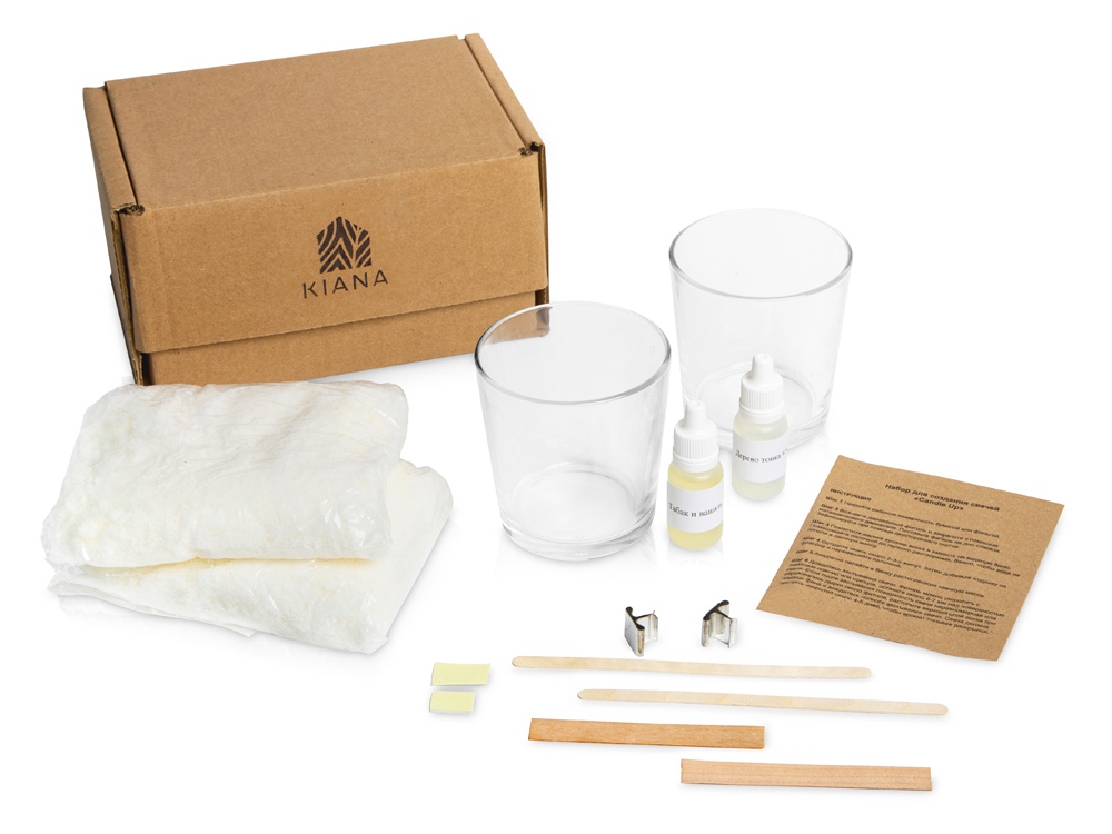 - Комплектность: свечная масса, 2 стеклянных стакана, 2 фитиля деревянных, 2 держателя для фитиля, 2 вида отдушки, инструкция