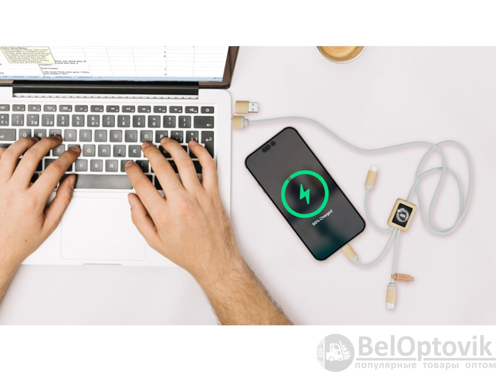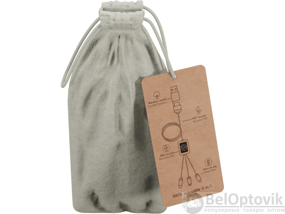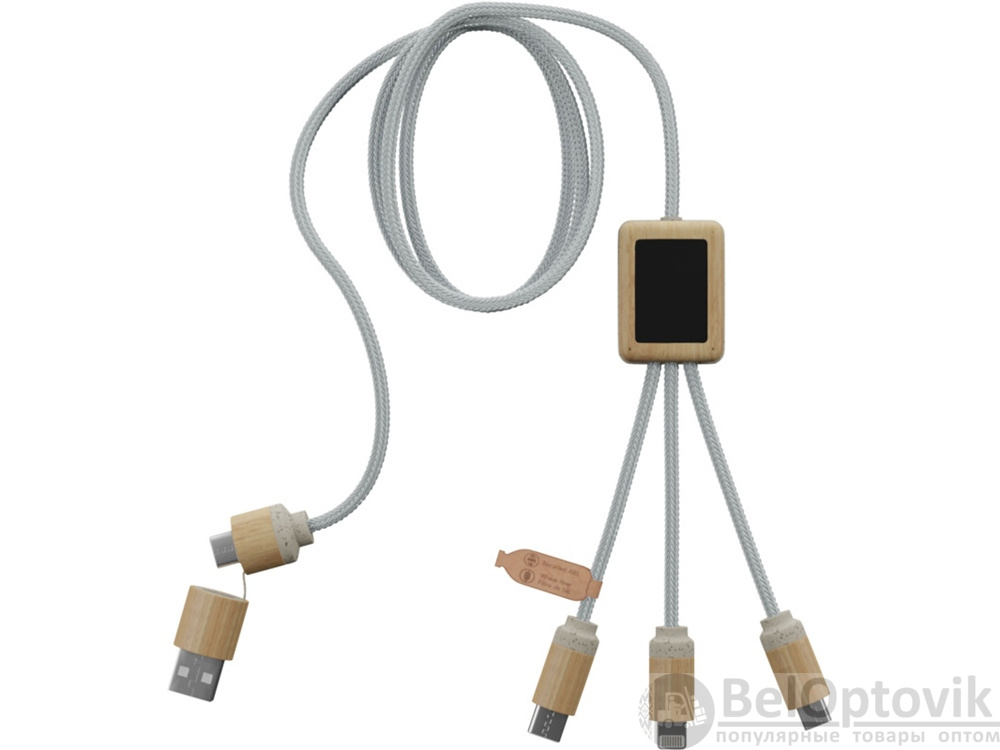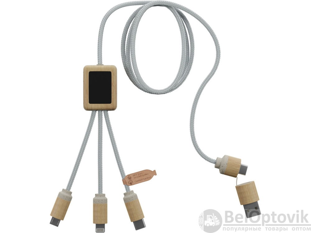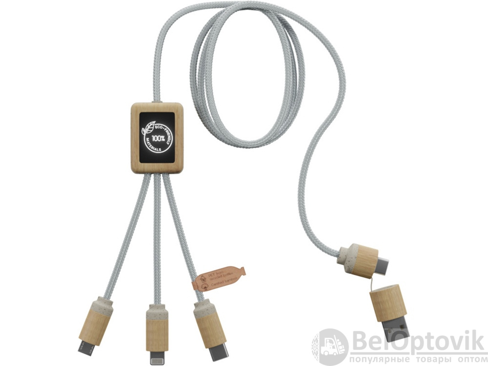 Кабель для быстрой зарядки на 2,4 А (3 x 10 см), обе стороны которого можно персонализировать разными светящимися логотипами. Кабель полностью изготовлен из более экологичных материалов: переработанных ПЭТ-кабелей, бамбука, пшеничных волокон и переработанной пластмассы. Зарядный кабель универсален благодаря 3 выходам (Type-C, Android, iPhone) и может заряжать до трех устройств одновременно. Благодаря двойному входу USB и USB-C кабель совместим с новейшими зарядными устройствами. Поставляется в хлопковой сумке (20 x 8 см) с карточкой из крафт-бумаги. Переработанный PET пластик, Бамбуковое дерево.