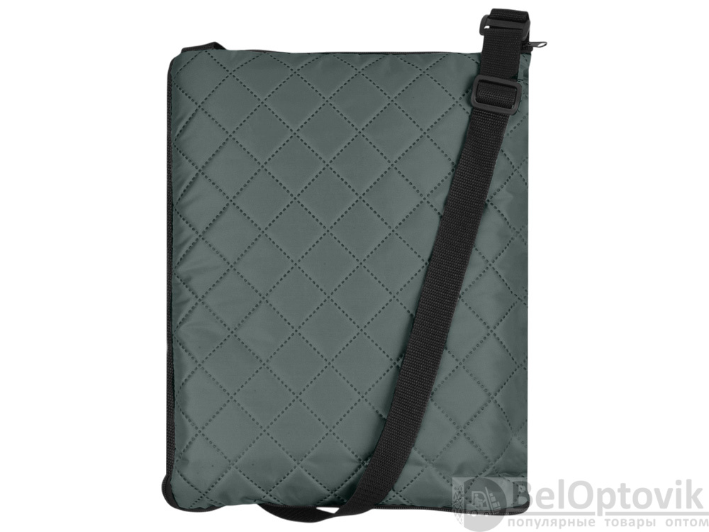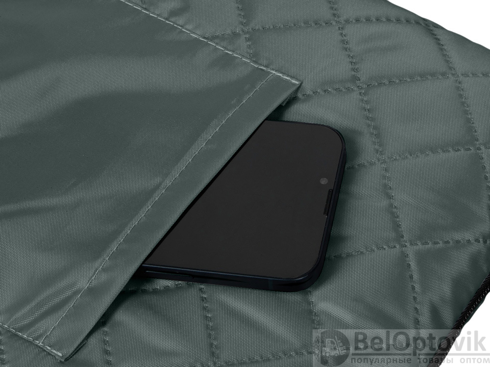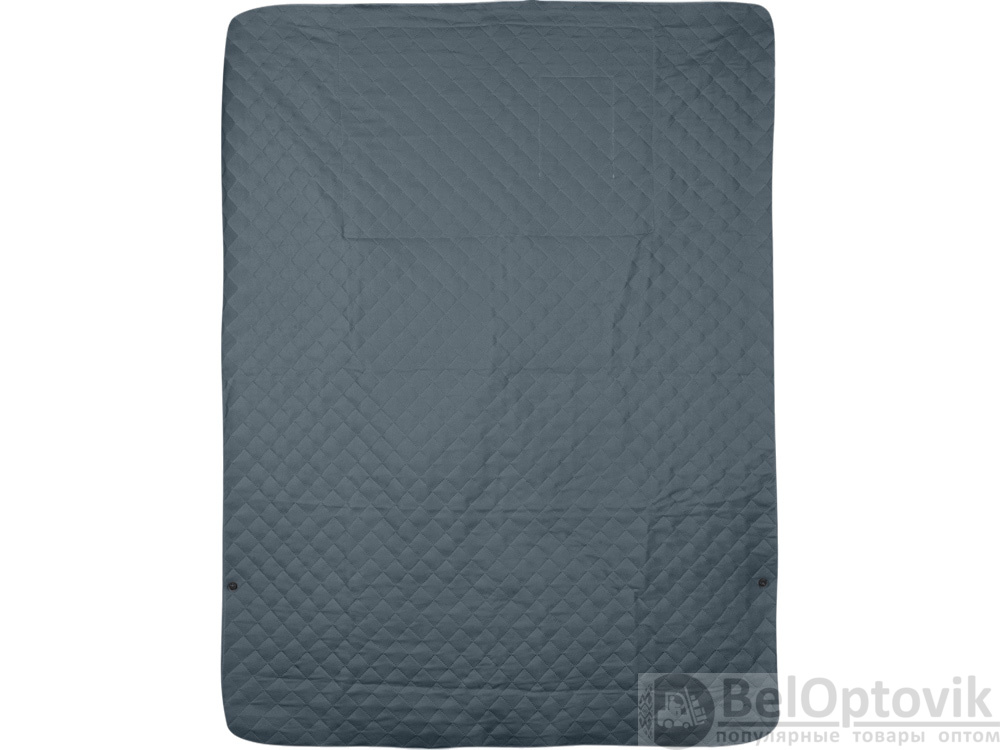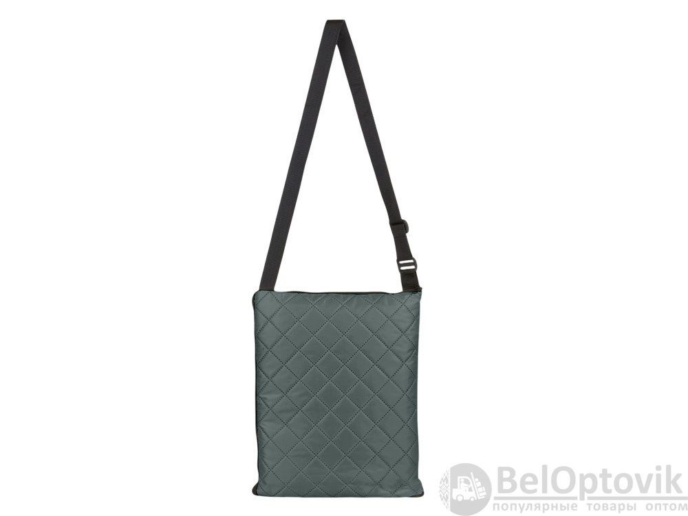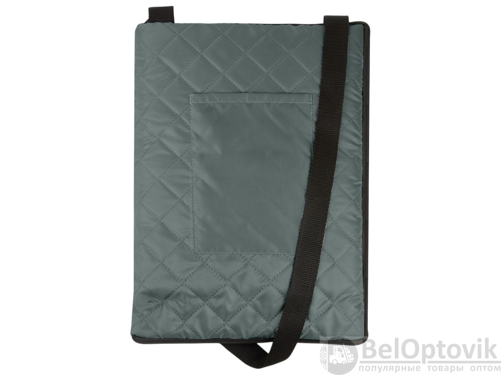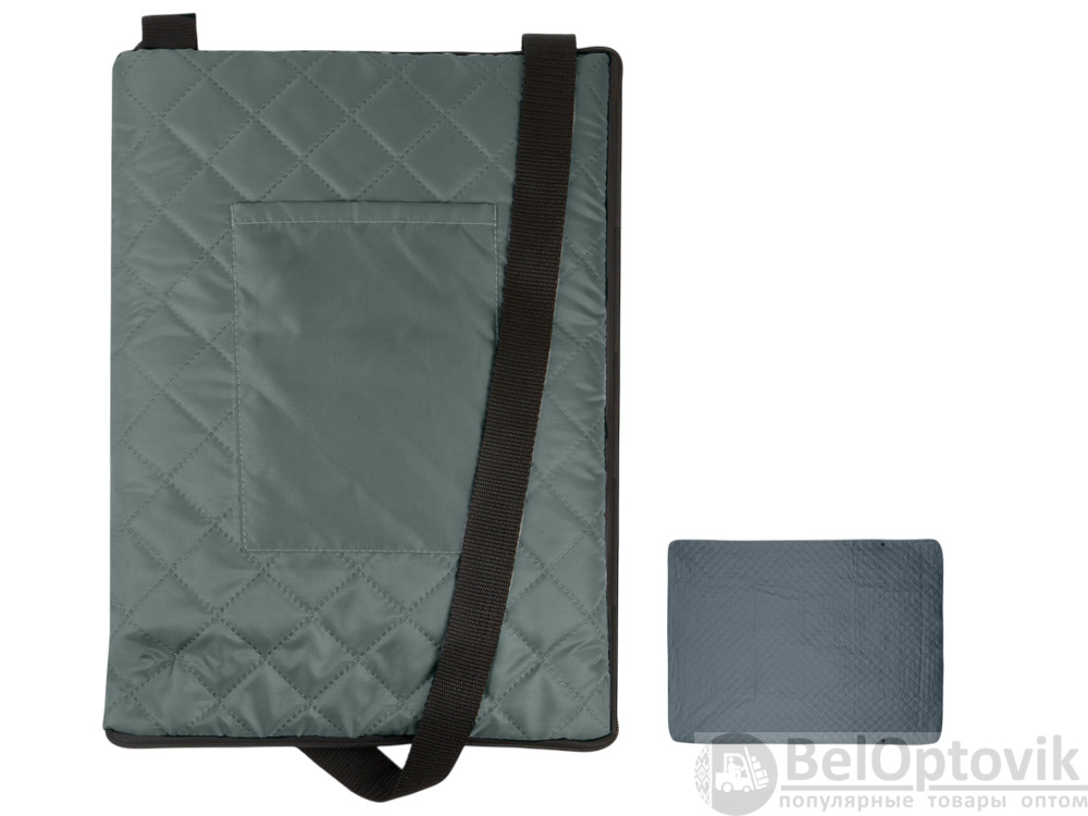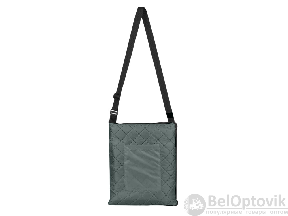 Двухсторонний плед с водоотталкивающим покрытием с одной стороны и мягким флисом с другой. Складывается в сумку на плечо и фиксируется с помощью молнии. В собранном виде имеет регулируемый по длине ремень для переноски и наружный карман для мелочей.