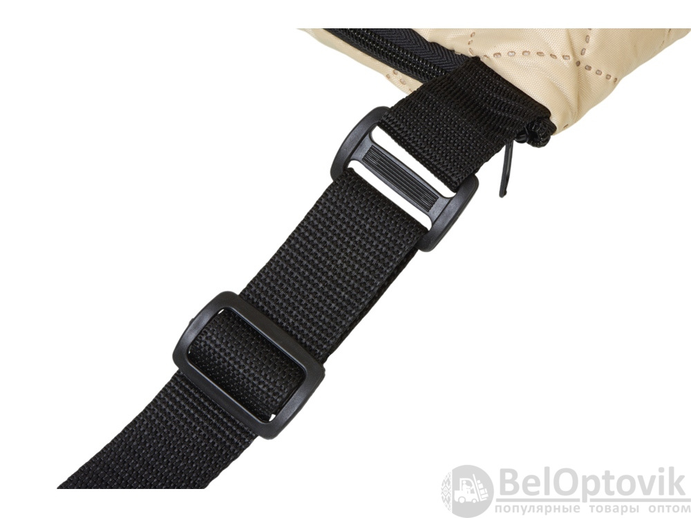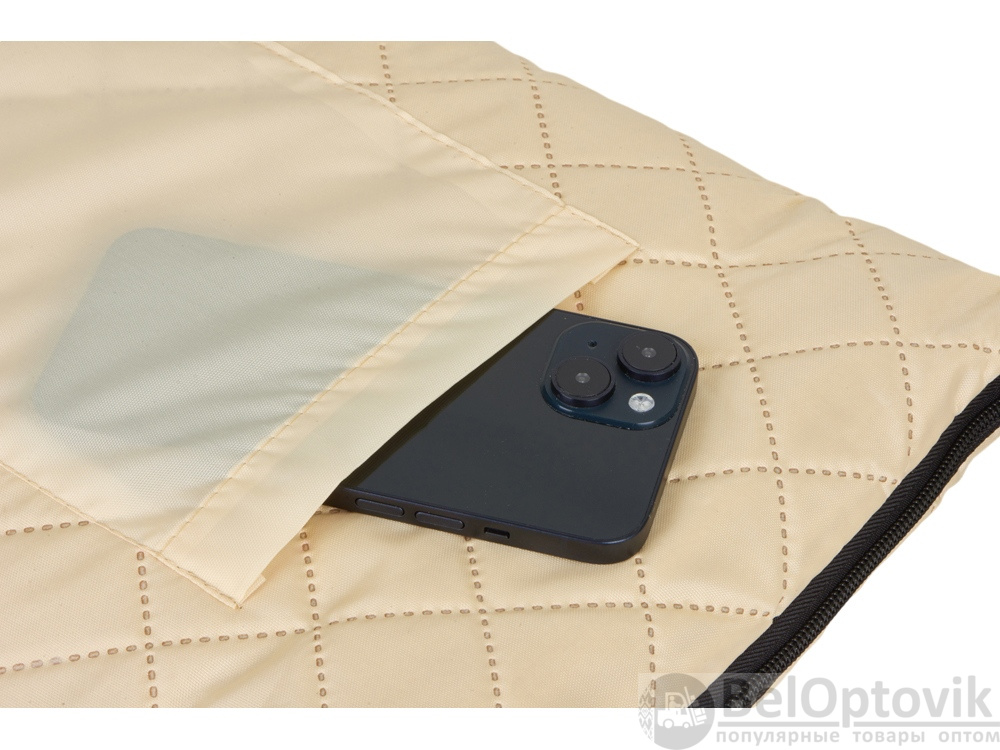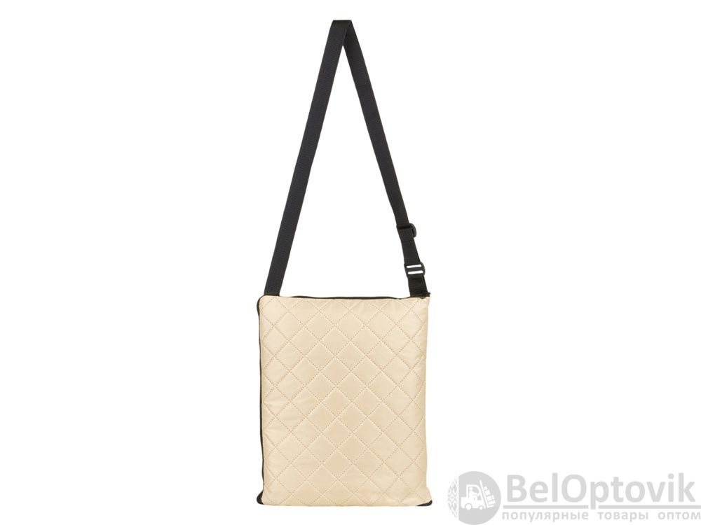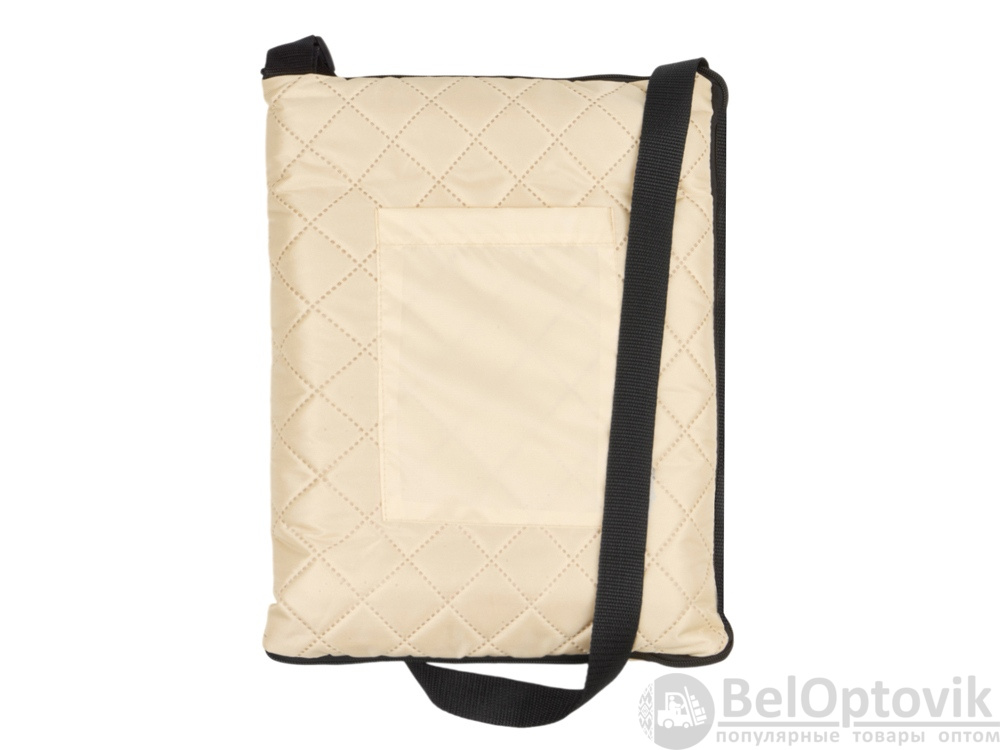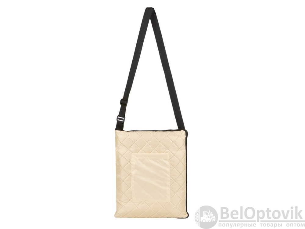 Двухсторонний плед с водоотталкивающим покрытием с одной стороны и мягким флисом с другой. Складывается в сумку на плечо и фиксируется с помощью молнии. В собранном виде имеет регулируемый по длине ремень для переноски и наружный карман для мелочей.