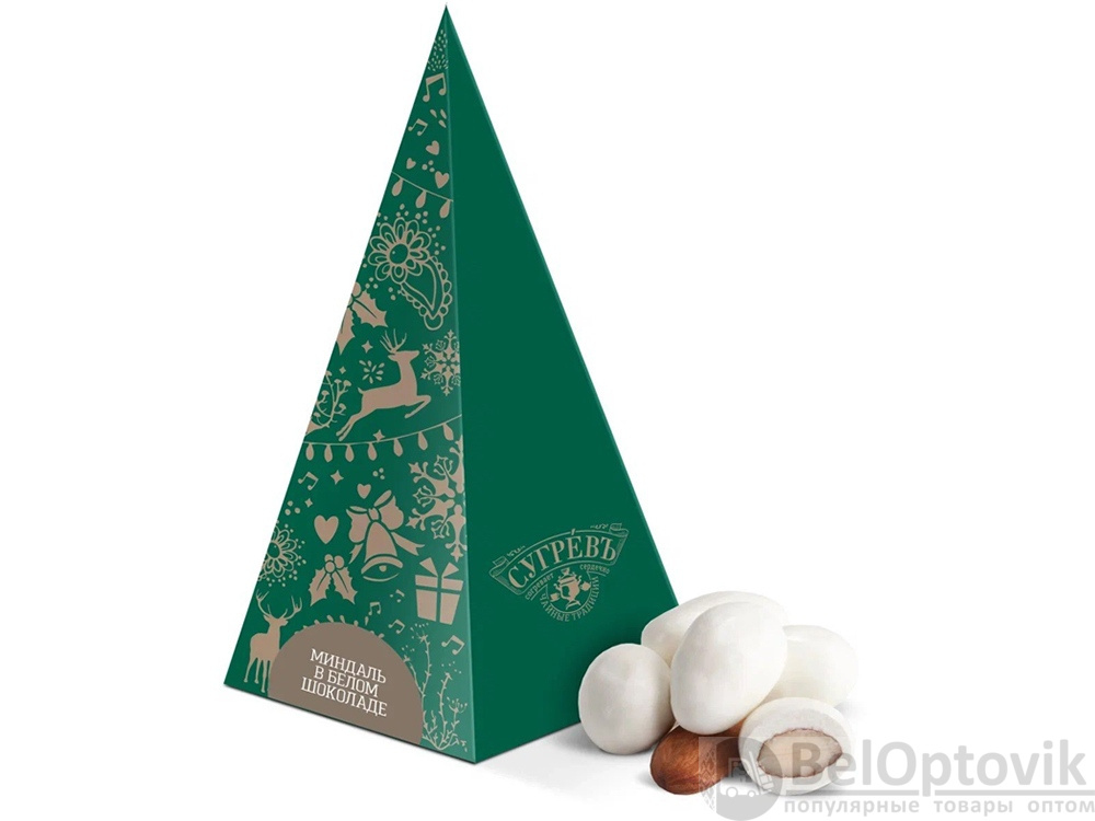 Картонная ёлка с выборочным УФ-лаком с миндалём в шоколадной глазури внутри. прекрасное дополнение к любому подарку на Новый Год и Рождество. Яркая праздничная упаковка и интересное наполнение.