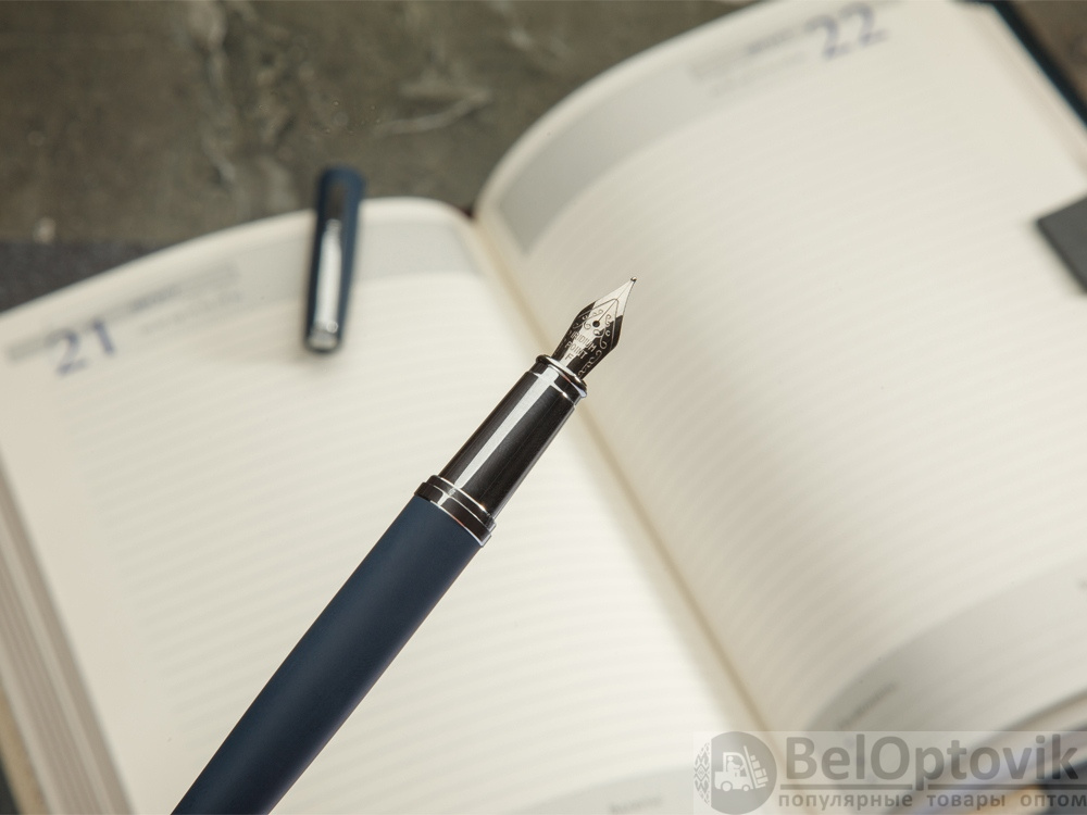 Cтильная перьевая ручка «Sienna» от Bruno Visconti синего цвета с контрастирующими элементами в цвет серебра. Благодаря покрытию Soft Touch пальцы не скользят по корпусу ручки, письмо комфортное и легкое. Ручка оснащена высококачественным механизмом подачи чернил, благодаря которому линия остается однородной и аккуратной. Чернила не токсичны, на основе водорастворимого красителя, не забивают фидер. Перьевой наконечник выполнен из иридиума и дополнен орнаментом.