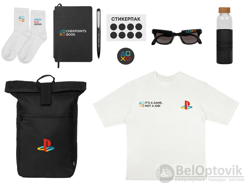 - Материал товара: рюкзак- 300D RPET полиэстер, футболка- 100% хлопок, джерси, носки- 80% хлопок, 15% полиамид, 5% эластан, бутылка- стекло, очки и держатель- пластик, ланъярд- полиэстер, ручка- металл, блокнот- термо PU