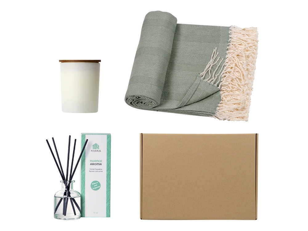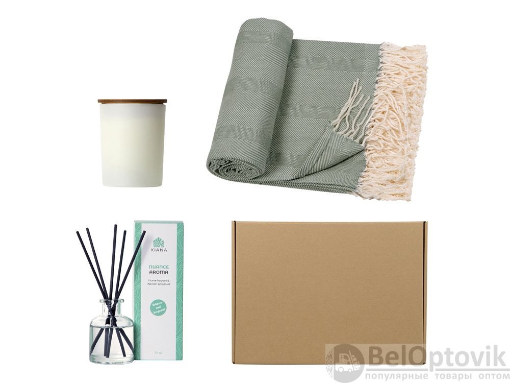 - Материал товара: плед - 100% хлопок, аромат для дома - стекло, фибровые палочки, свеча - воск, стекло, дерево, коробка - картон