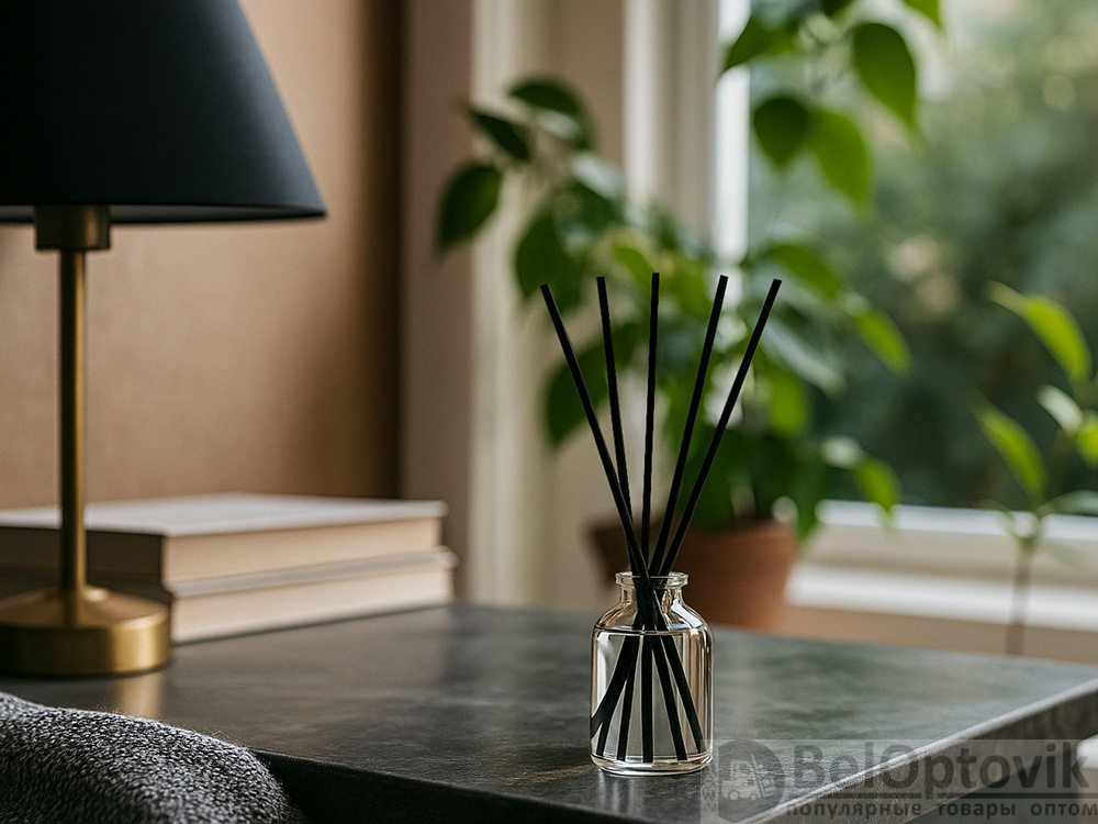 Прозрачный флакон без лишних деталей гармонично впишется в любой интерьер, а чёрные фибровые палочки обеспечат равномерное и продолжительное распространение аромата.