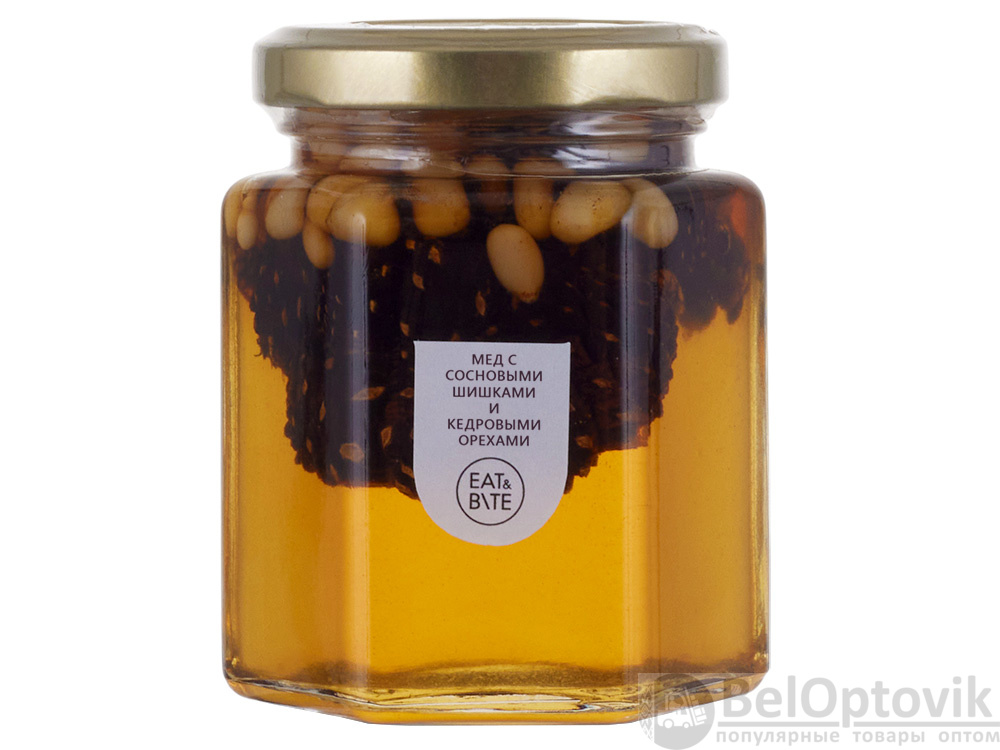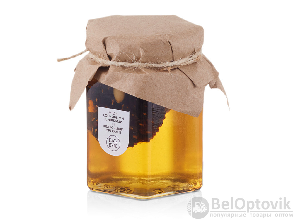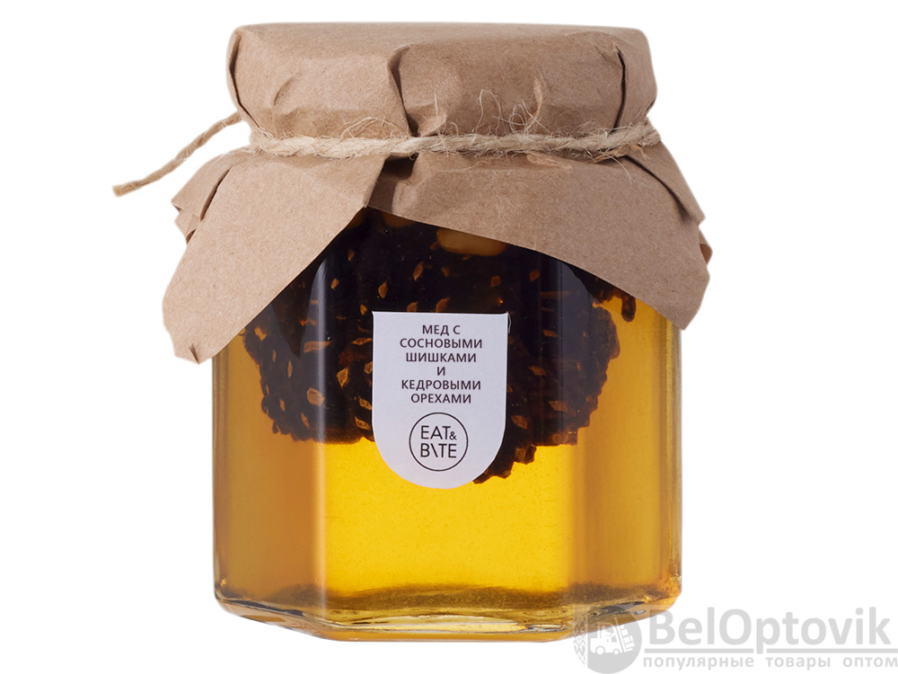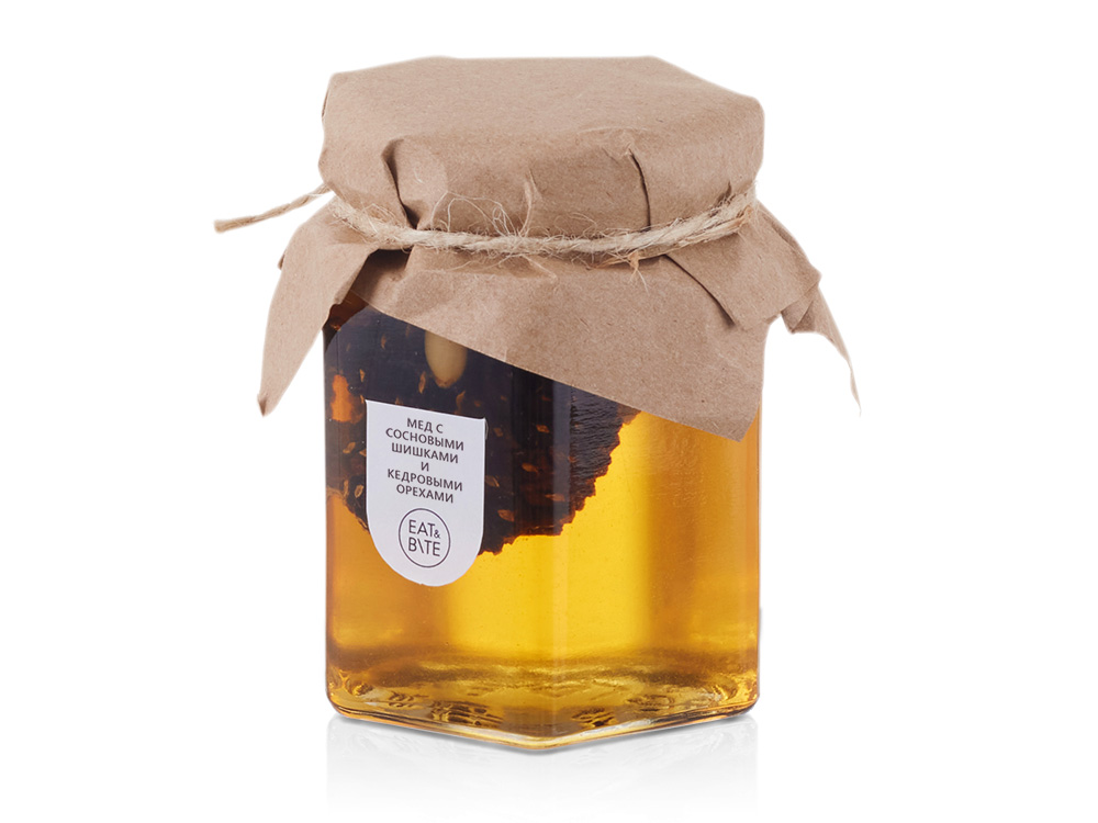 - Состав: мед натуральный, сосновая шишка, ядро кедрового ореха