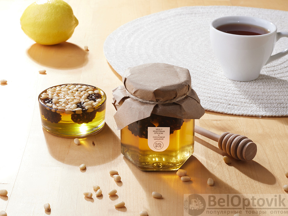 Натуральный мёд, в сочетании с хрустящими кедровыми орехами и молодыми сосновыми шишками — это не просто лакомство, а настоящий природный эликсир. Медовый десерт не только вкусный, но и полезный, идеально подойдет для чаепития, поэтому подобный подарок можно также дополнить чаем.