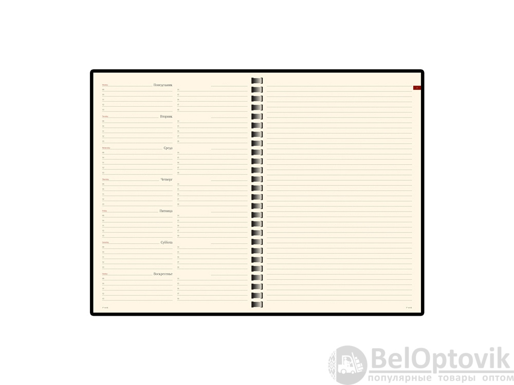 Недатированный блок состоит из 128 страниц, укреплённых на пластиковом полускрытом гребне. На 21 странице размещена справочная информация на русском языке. День недели указан на русском и английском языках.